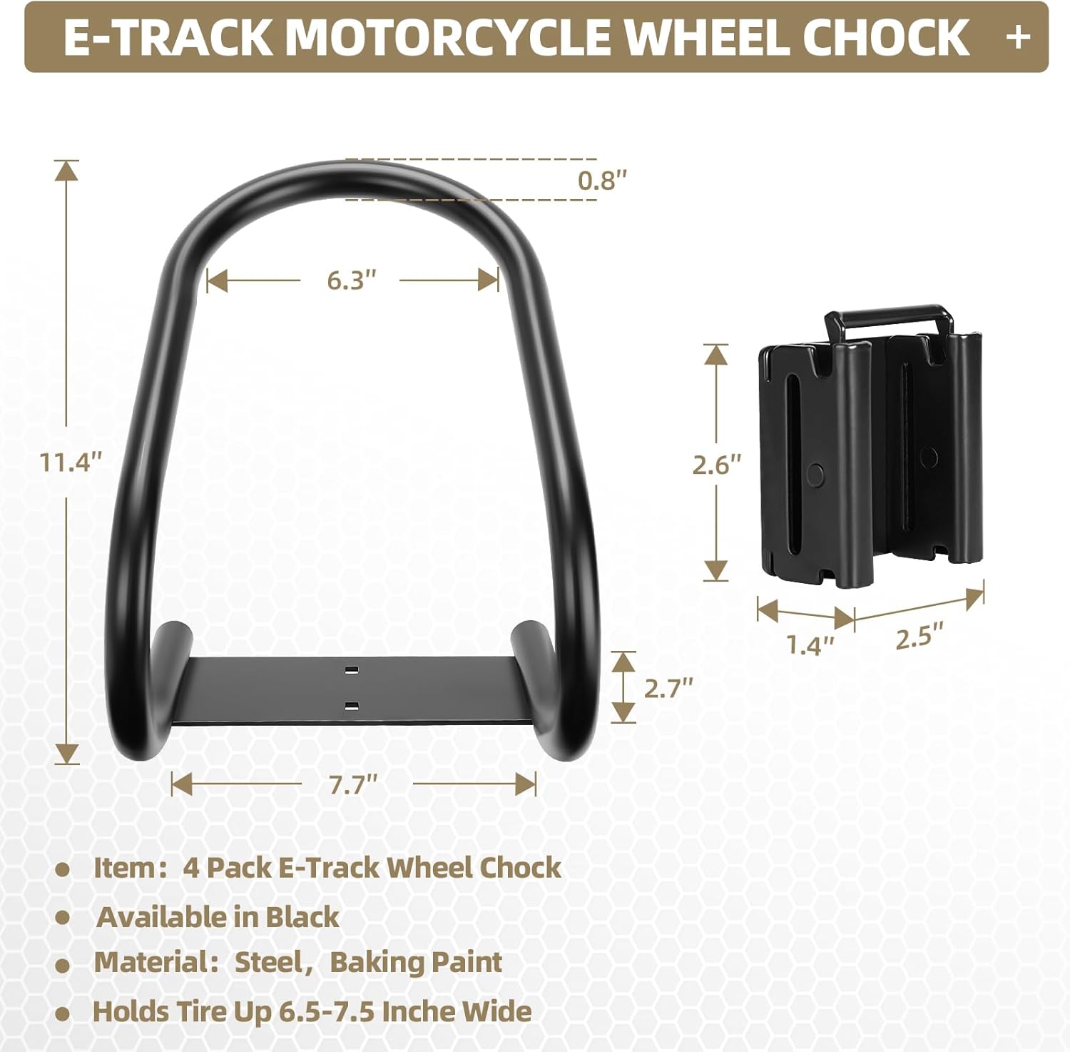 - Application:Our motorcycle wheel chock is incredibly easy to install. Simply clip it into the E-track rail slots, and you're good to go. Use the E-track wheel chocks to securely mount your motorcycle, dirt bike, or any other bike to the E-Track rails. Enjoy a hassle-free and secure way to transport your bikes with our reliable motorcycle chocks.
