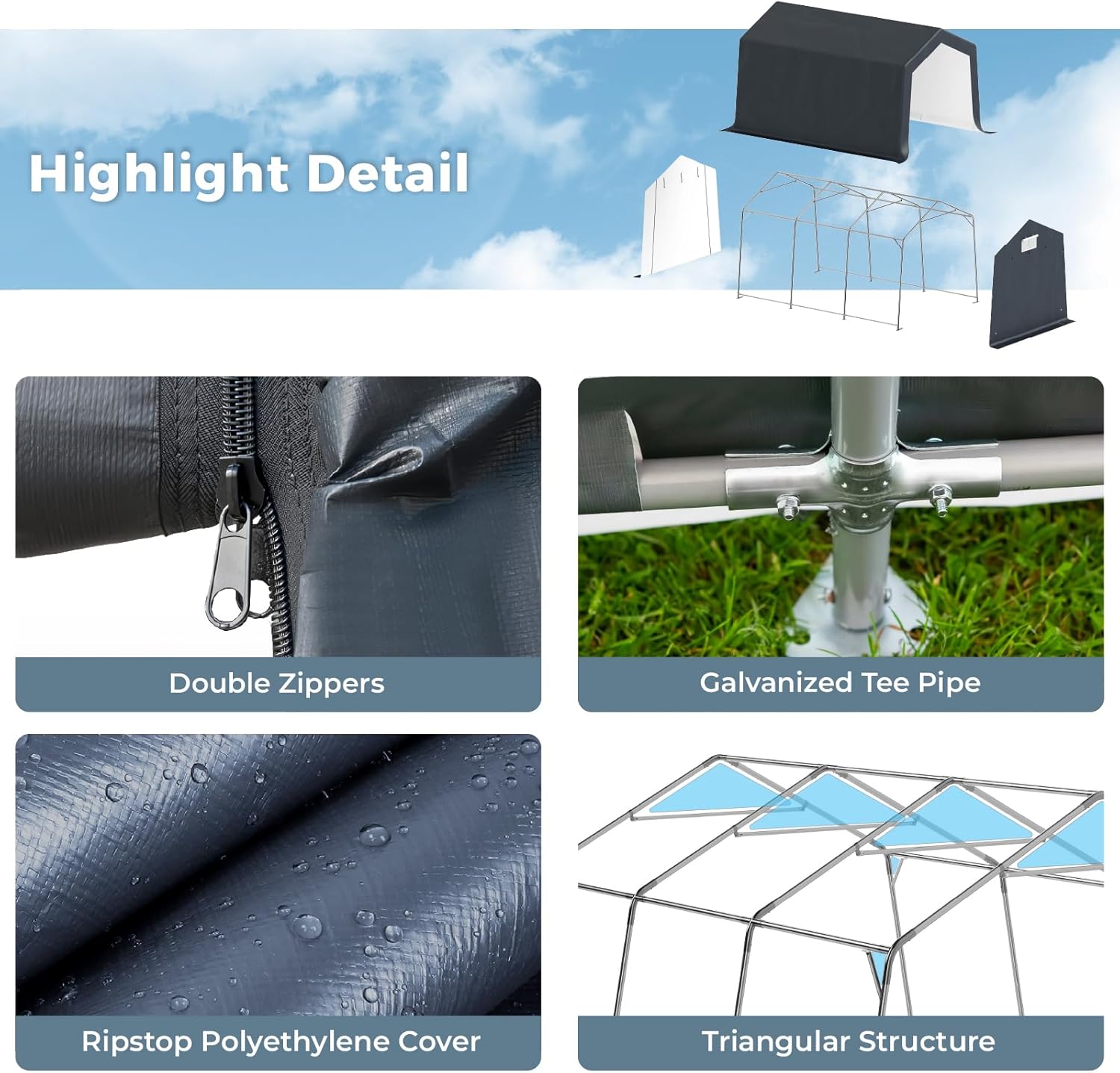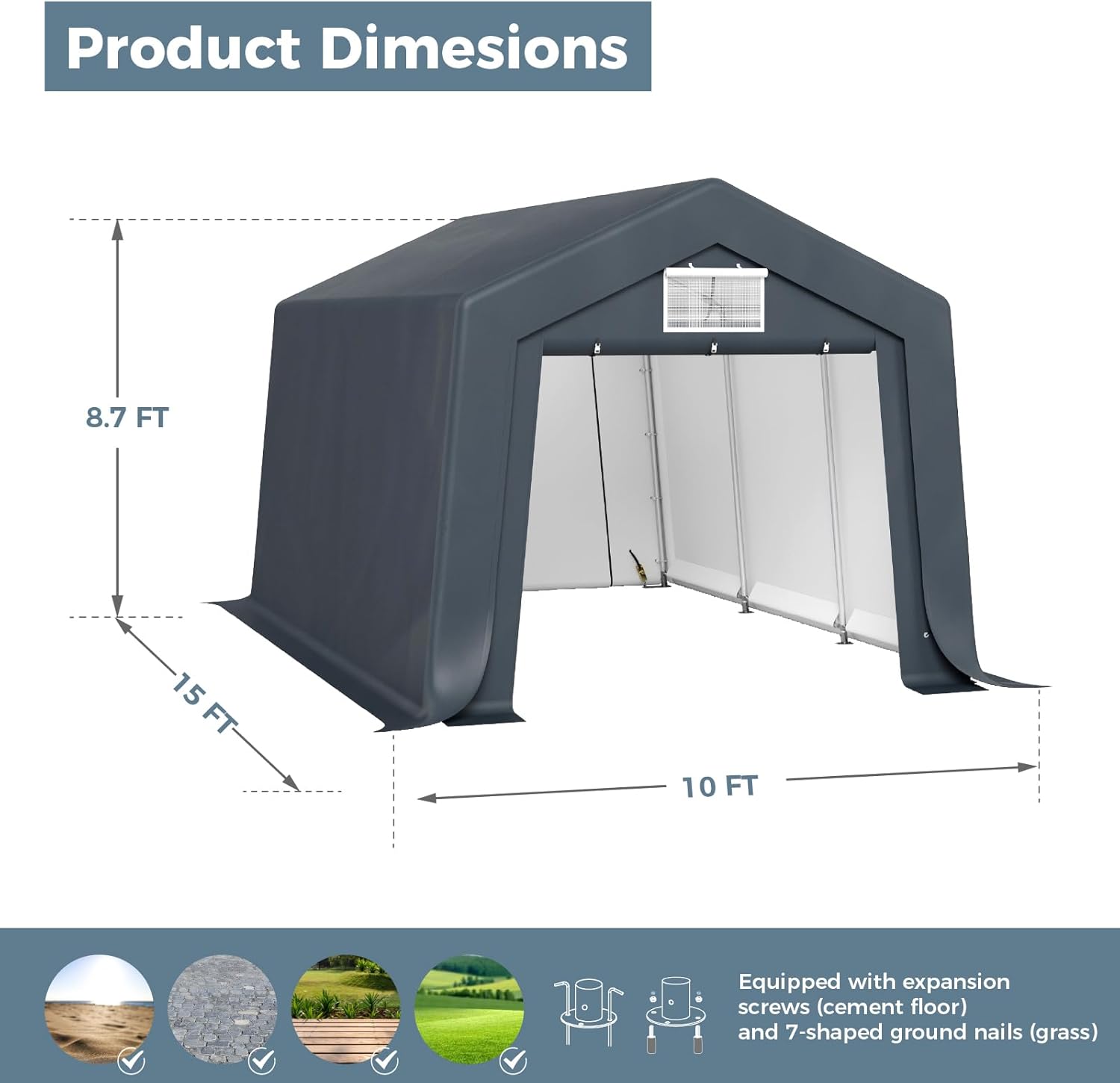 GREEN PARTY Storage Shelter Shed, 10x15 ft Portable Shed Outdoor Carport with Roll-up Zipper Door & Vents, Outdoor Storage Shed Portable Garage for Motorcycle, Bike, Waterproof & UV Protected, Gray