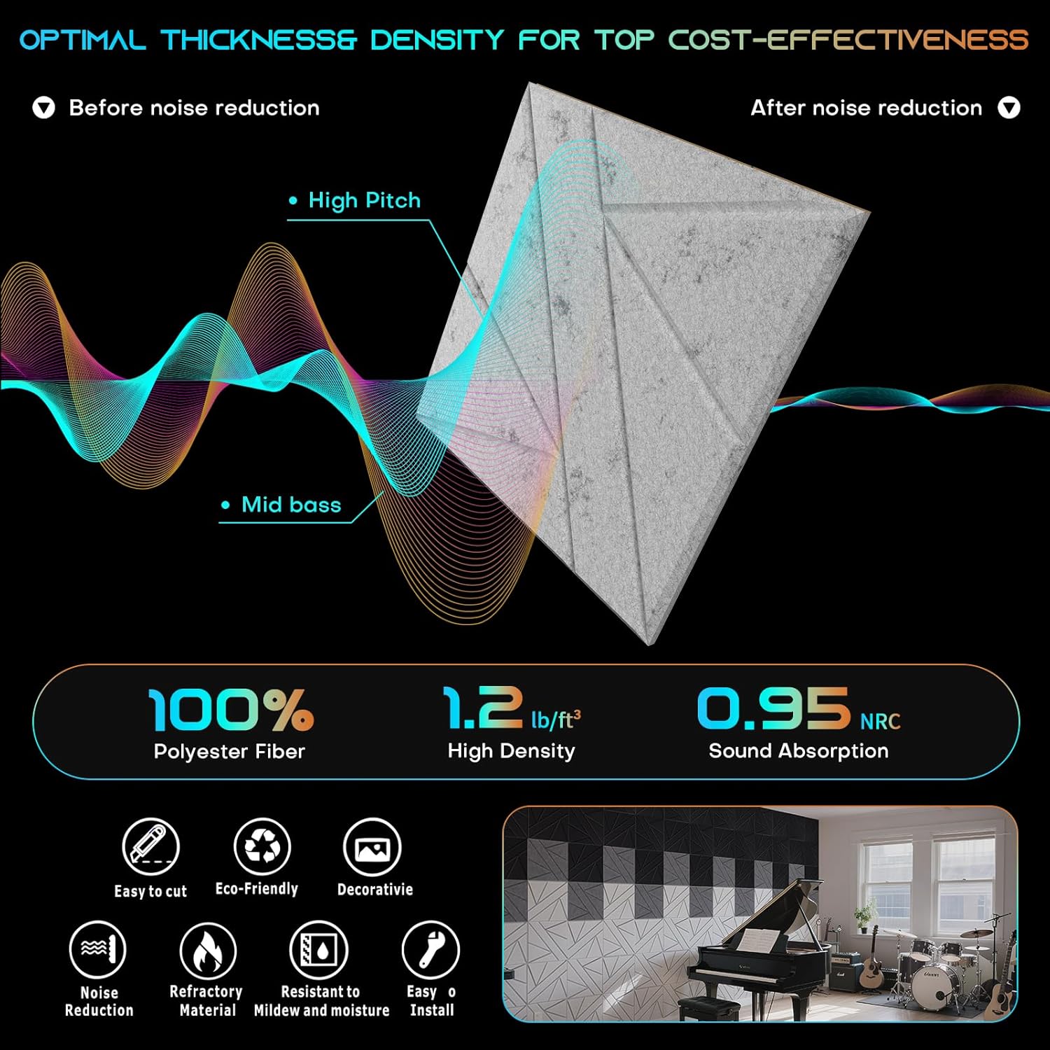 - 【Excellent Quality】: This wall soundproofing foam board is made of high-quality 100% polyester, odorless and flame retardant. There are no risks associated with spending long periods of time in a room with acoustic foam panels. And compared with traditional sound-absorbing panels, our products have higher thickness (25% thicker) and density (35% denser),which means better durability and sound absorption.
