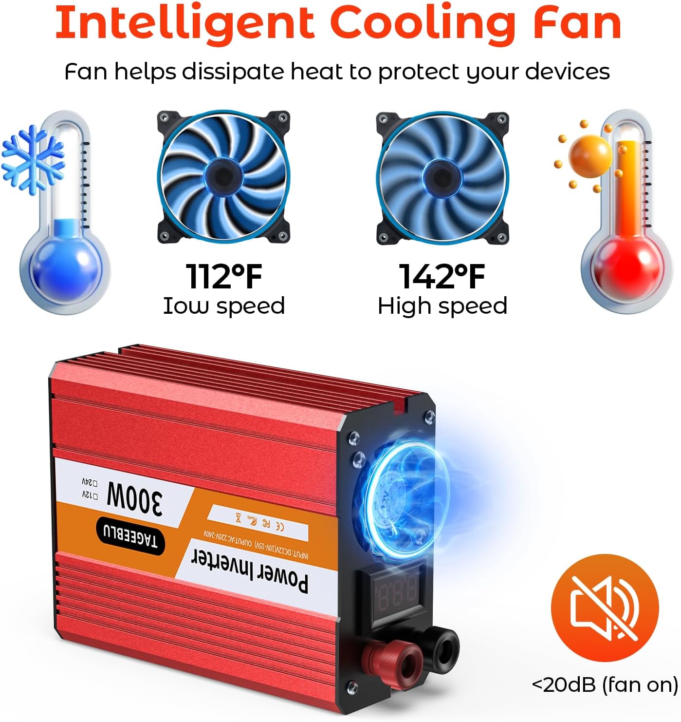 - 【Quiet cooling fan】Smart cooling fan system makes the car power inverter very silent. Built-in intelligent chip control. The fan speeds up when the unit temperature rises to 113°F (45°C) or when the output power exceeds 80W
