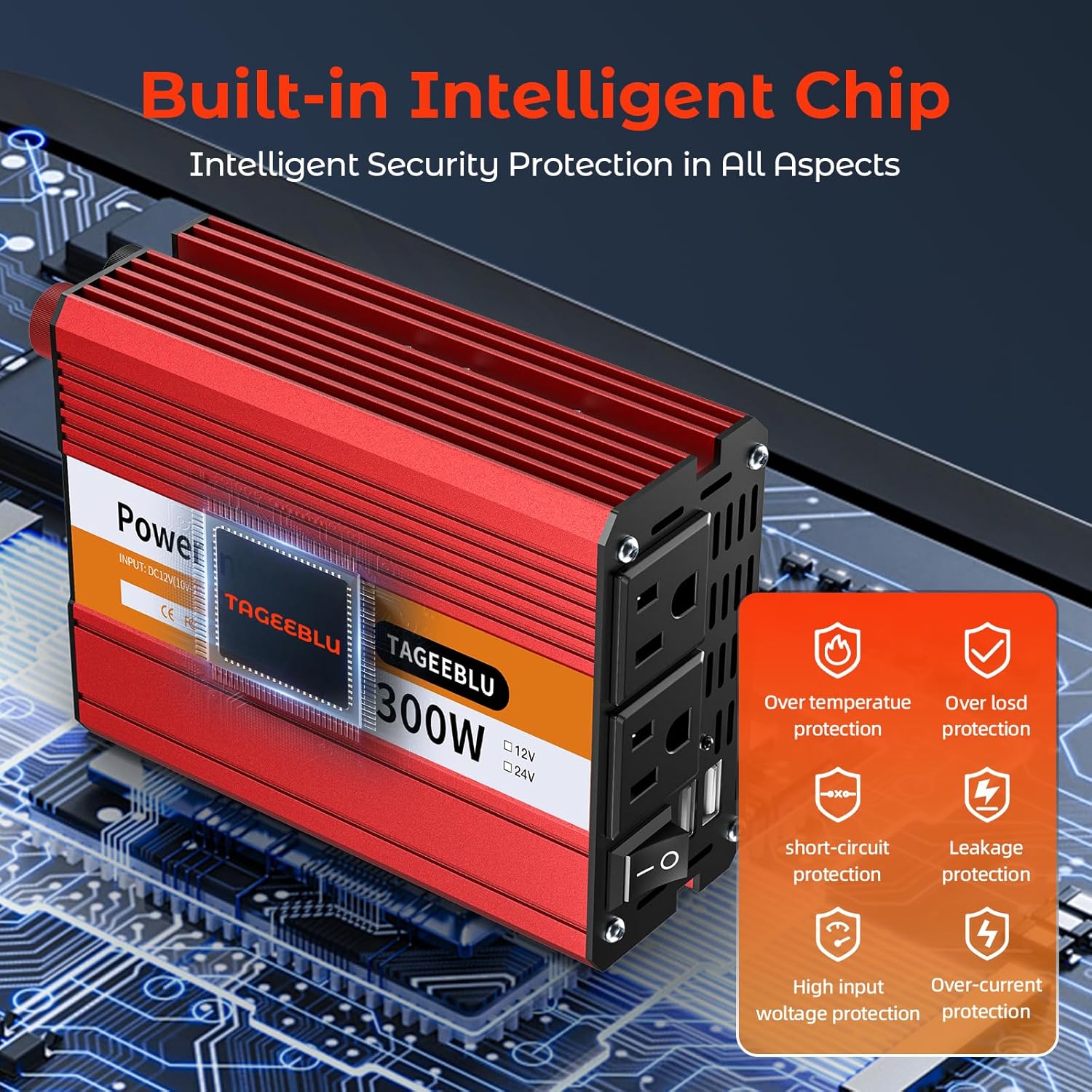 - 【TAGEEBLU Power Inverter Basics】This inverter provides a steady 300W of DC to AC power with a peak output of 600W. Equipped with dual 110V AC sockets and two high-speed 2.1A USB ports, it's perfect for powering your devices on the go