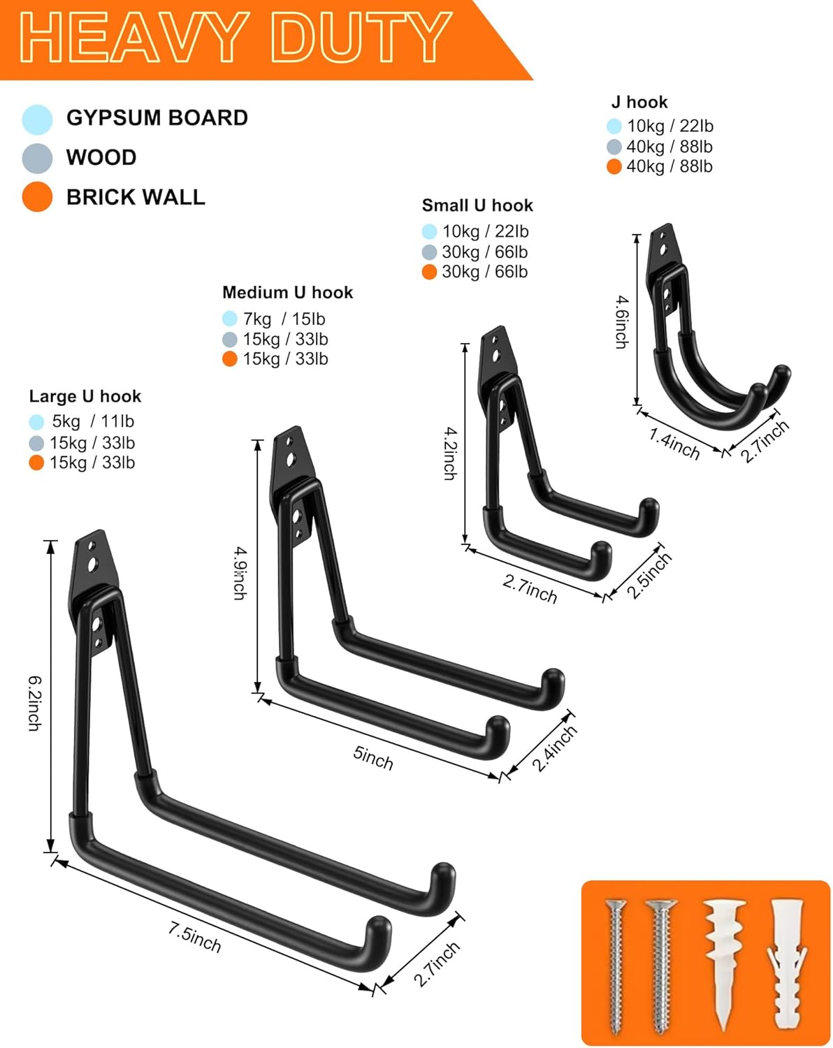 - Easy Installation: The garage hooks come with two types of screws, including 24 sets of screws and wall anchors, suitable for concrete walls, wooden walls, and brick walls.