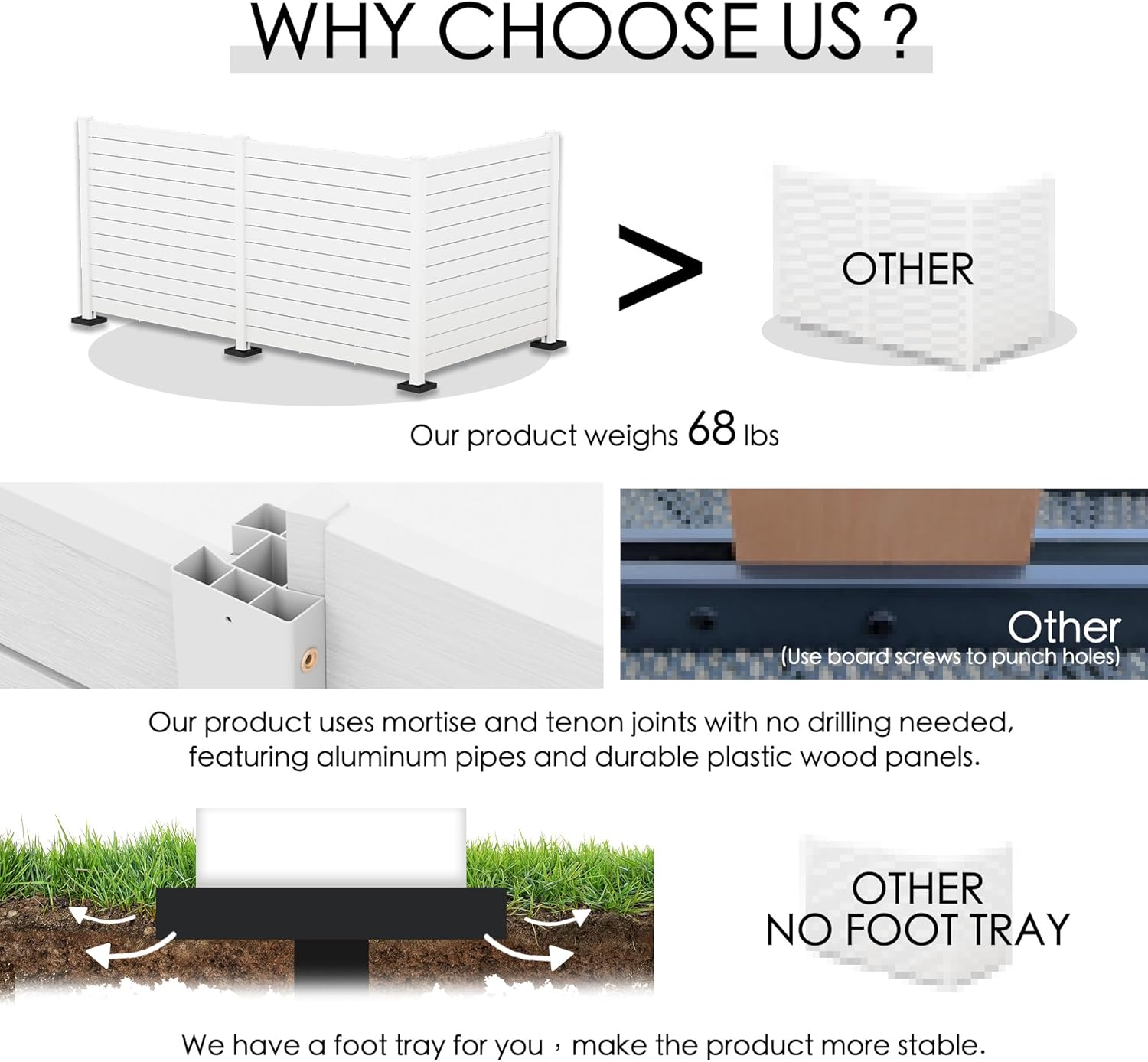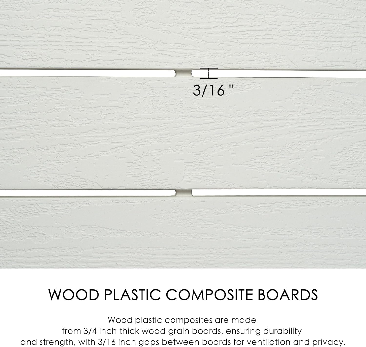 - π‘ High-Quality Material: Our outdoor privacy screens are crafted from medium-density polyethylene, designed with a wood-like appearance that is more resistant to water and corrosion than cast iron. The 3/16-inch gaps between the boards provide ventilation while maintaining privacy. The smooth surface resists dust and stains, and the simple white color complements any setting.