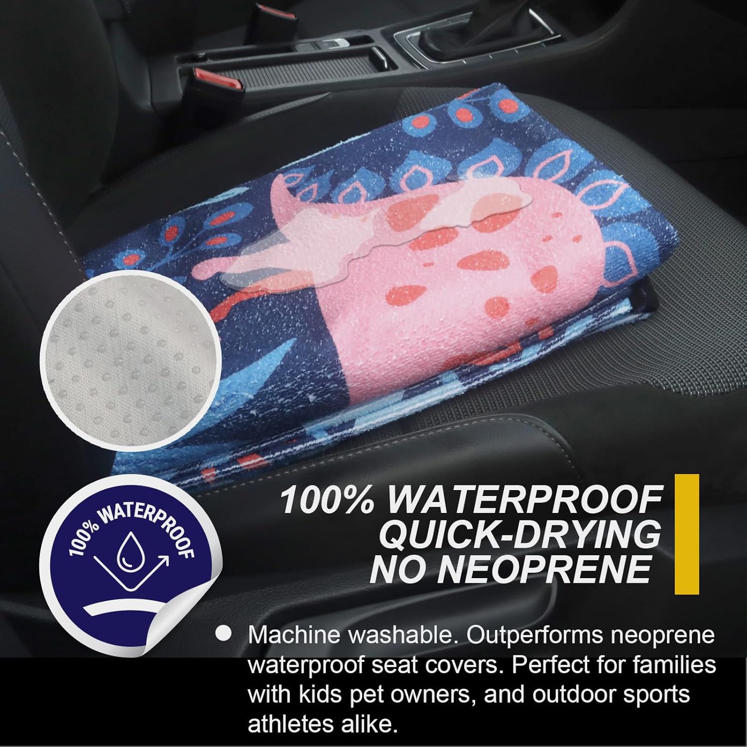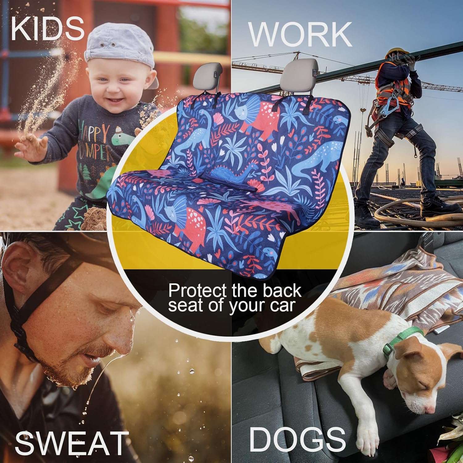 - Made From 3 Layer Material: (Front) Dinosaur pattern printed on towel cloth, which gives the rear seat cover a good look and a super long life. It is perfect for leather or upholstery back seats. (Middle) Waterproof fabric that is designed to guard your backseat against moisture and sweat. (Back) This rear seat cover are designed with a non-slip backing fabric that's super comfortable and won't slip off your back seat.