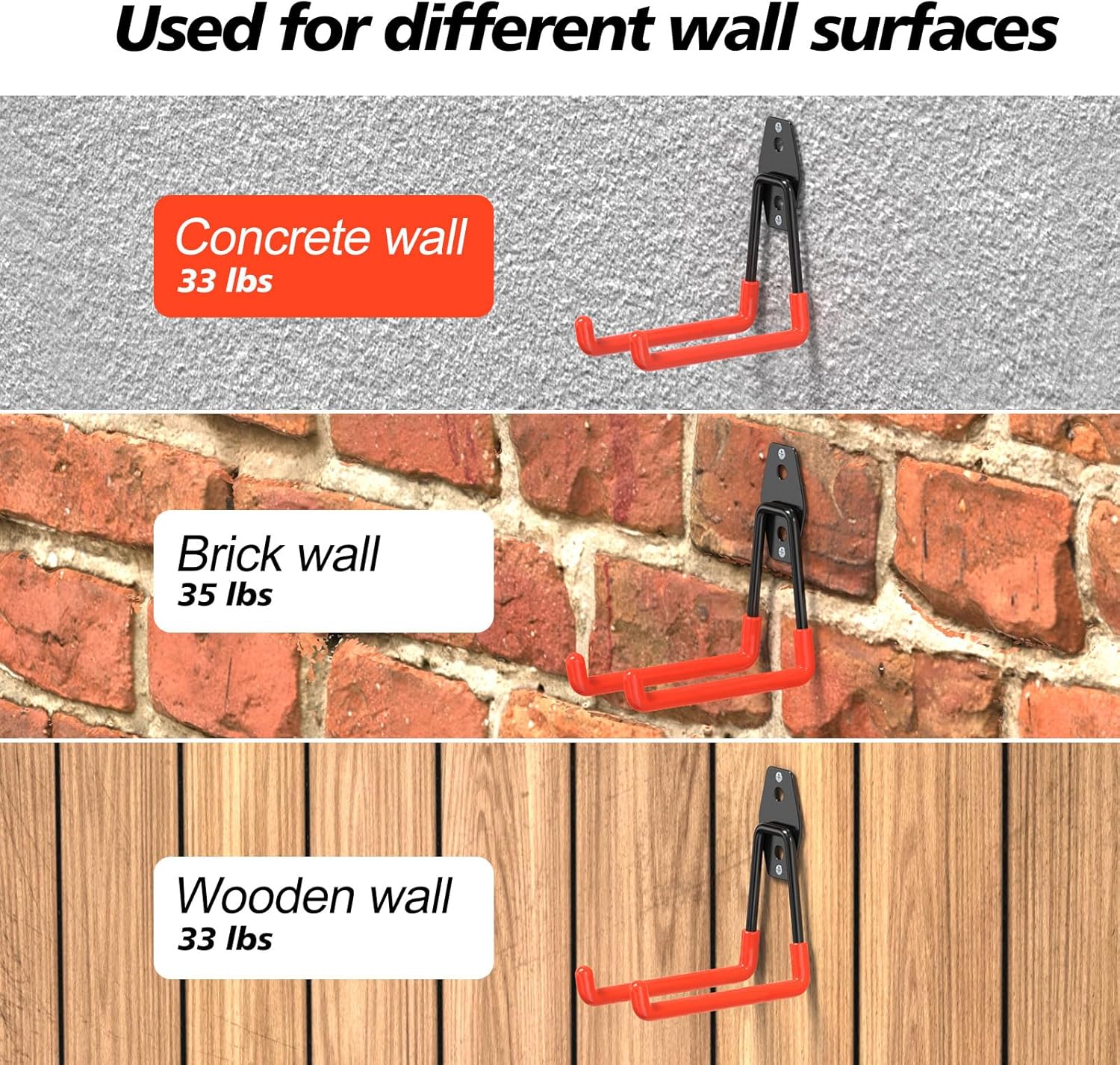 - SIMPLE INSTALLATION:The garage wall hook is equipped with two types of screws and an operating manual. Can be installed on wooden walls, concrete walls, and gypsum walls. The load-bearing capacity of each wall is different