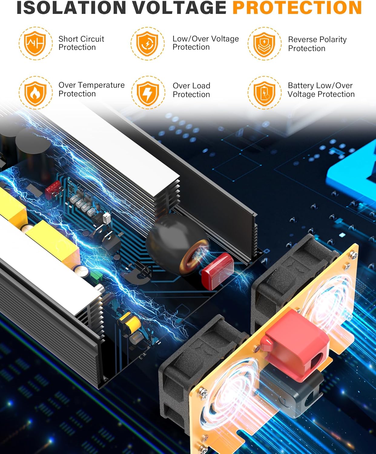 - 【MULTI-PROTECTION FOR SAFETY】The inverter features an isolated input/output stable design and provides 6 levels of protection, including over voltage, overload, over-heating, under-voltage, short circuit, and reverse polarity protection.