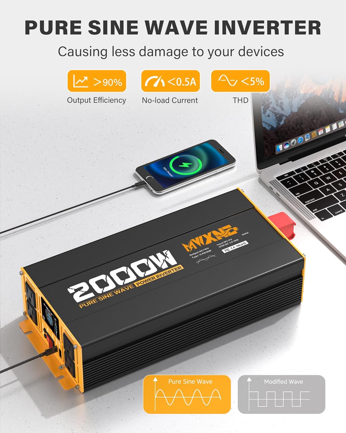 - 【POWERFUL 2000W INVERTER】MWXNE inverter 12v to 110V 120V provides a continuous PURE SINE WAVE power of 2000W, with a peak surge of 4000W during load start-up. The power inverters have a conversion efficiency of over 90%, reducing conversion loss.