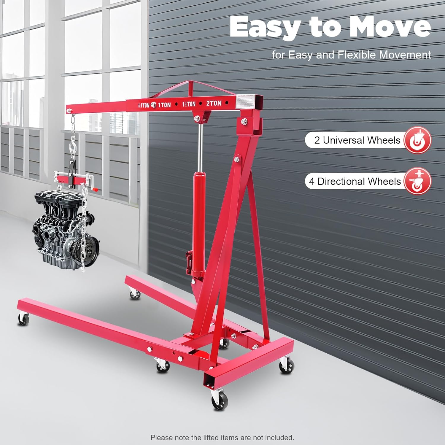 Folding Engine Crane 2 Ton Folding Engine Hoist with Engine Leveler 4400lbs Hydraulic Crane with 6 Iron Caster Wheels for Garage, Workshop (Red)