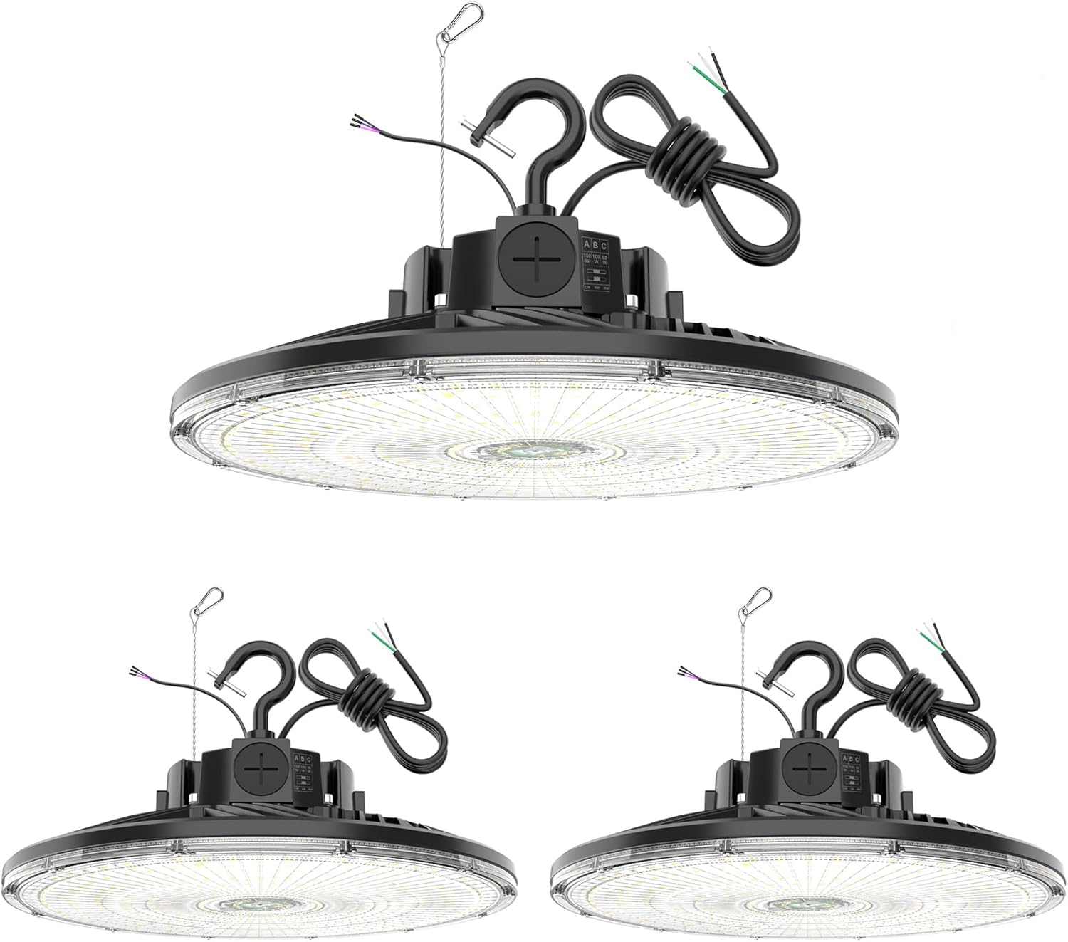 - 【3 Wattage Selectable】Using our led high bay light is equivalent to having 3 brightness LED lights 150W/100W/80W, which is equivalent to providing 21,000 lumens/14,000 lumens/11,200 lumens. Simply slide the switch to select the perfect wattage before installation to meet your different needs in warehouse, workshop, factory, garage, barn and other industrial and commercial places.