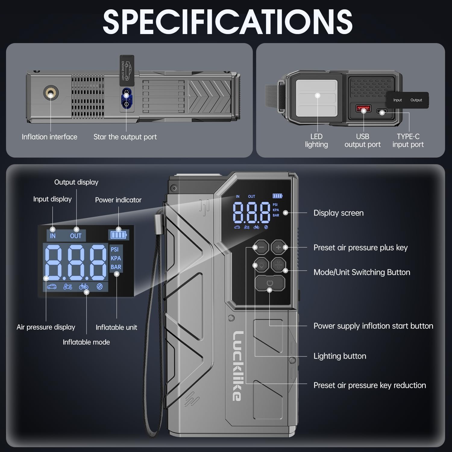 - 【150PSI Tire Inflator with Tire Presssure Detection】 -- This car battery jump starter built-in air pump supports 4 modes: cars, motorcycles, bicycle, balls etc. Also with the 3 unit switching. (BAR, KPA, PSI). It also support tire pressure detection function, connect the air pipe to the corresponding interface of the machine,the display screen will display the current tire pressure data.