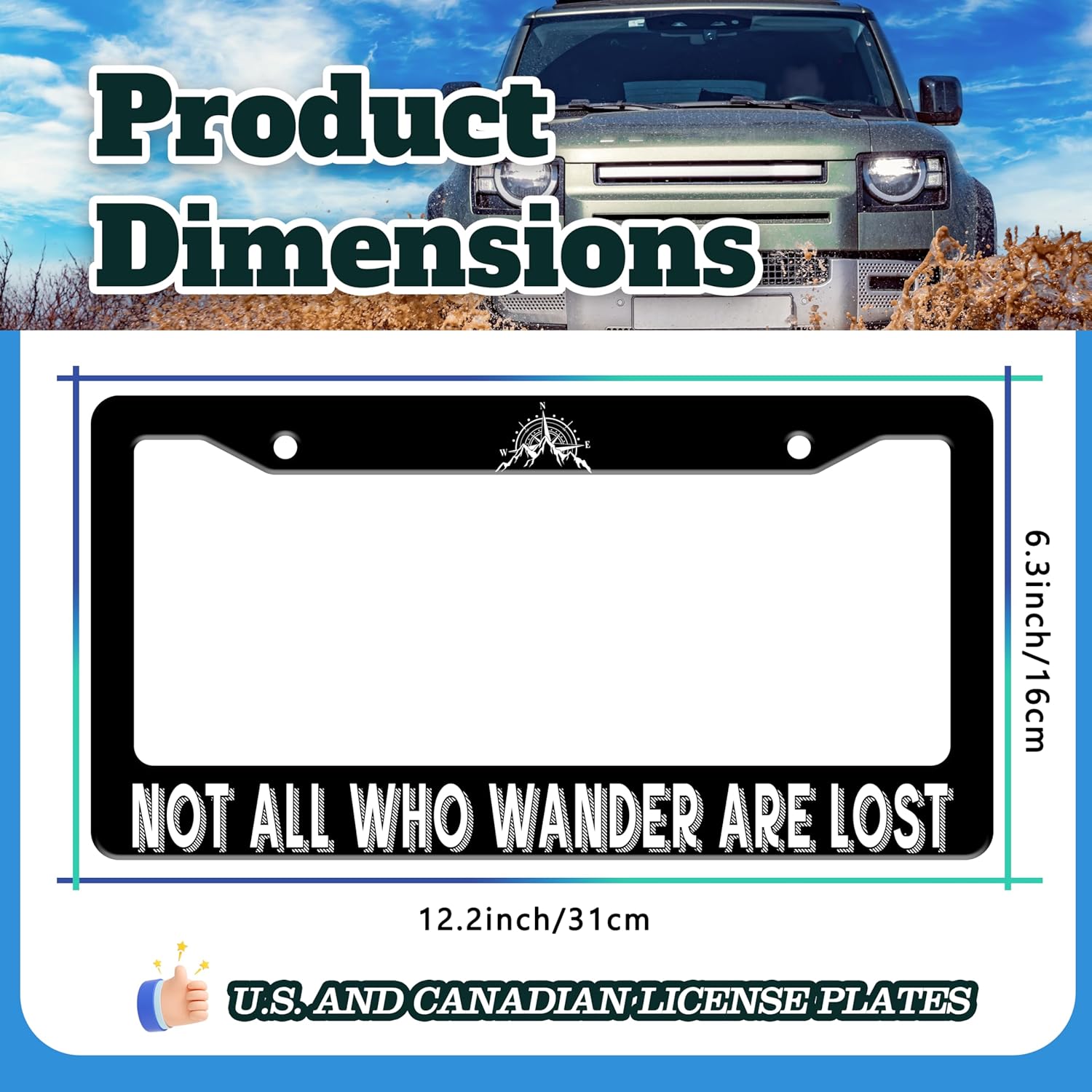 Not All Who Wander are Lost License Plate Frame Mountain Compass Stainless Steel License Plate Holder for Front or Rear Car Tags Funny for Car Decoration with Screws 6.3 X 12.2 in for Women Men