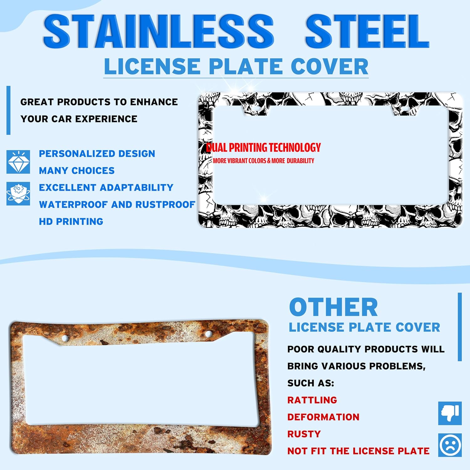 - STAINLESS STEEL LICENSE PLATE: The material is strong and not easy to bend, and can be used for a long time.The multi-layer protective design treatment improves your experience of using the license plate frame.