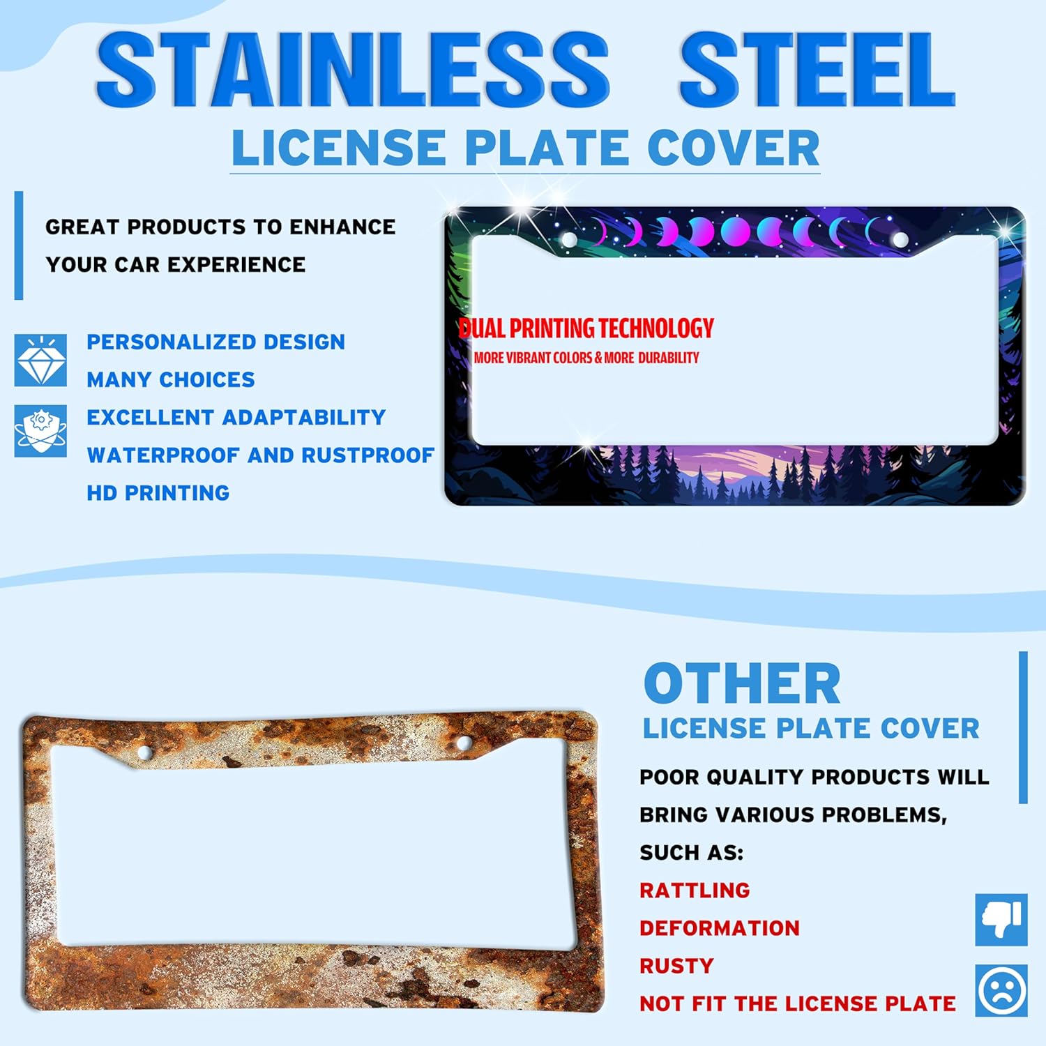- STAINLESS STEEL LICENSE PLATE: The material is strong and not easy to bend, and can be used for a long time.The multi-layer protective design treatment improves your experience of using the license plate frame.