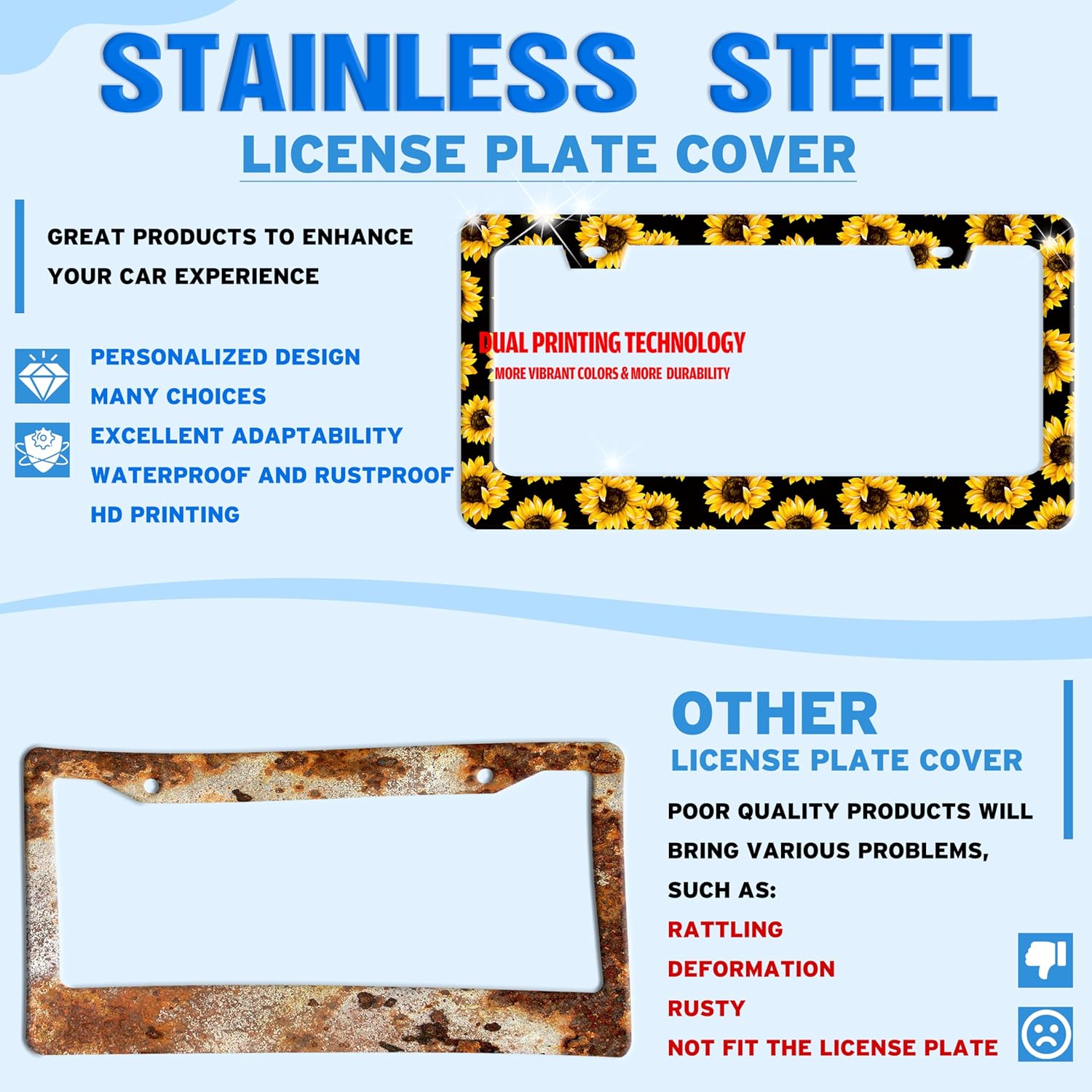 - STAINLESS STEEL LICENSE PLATE: The material is strong and not easy to bend, and can be used for a long time.The multi-layer protective design treatment improves your experience of using the license plate frame.