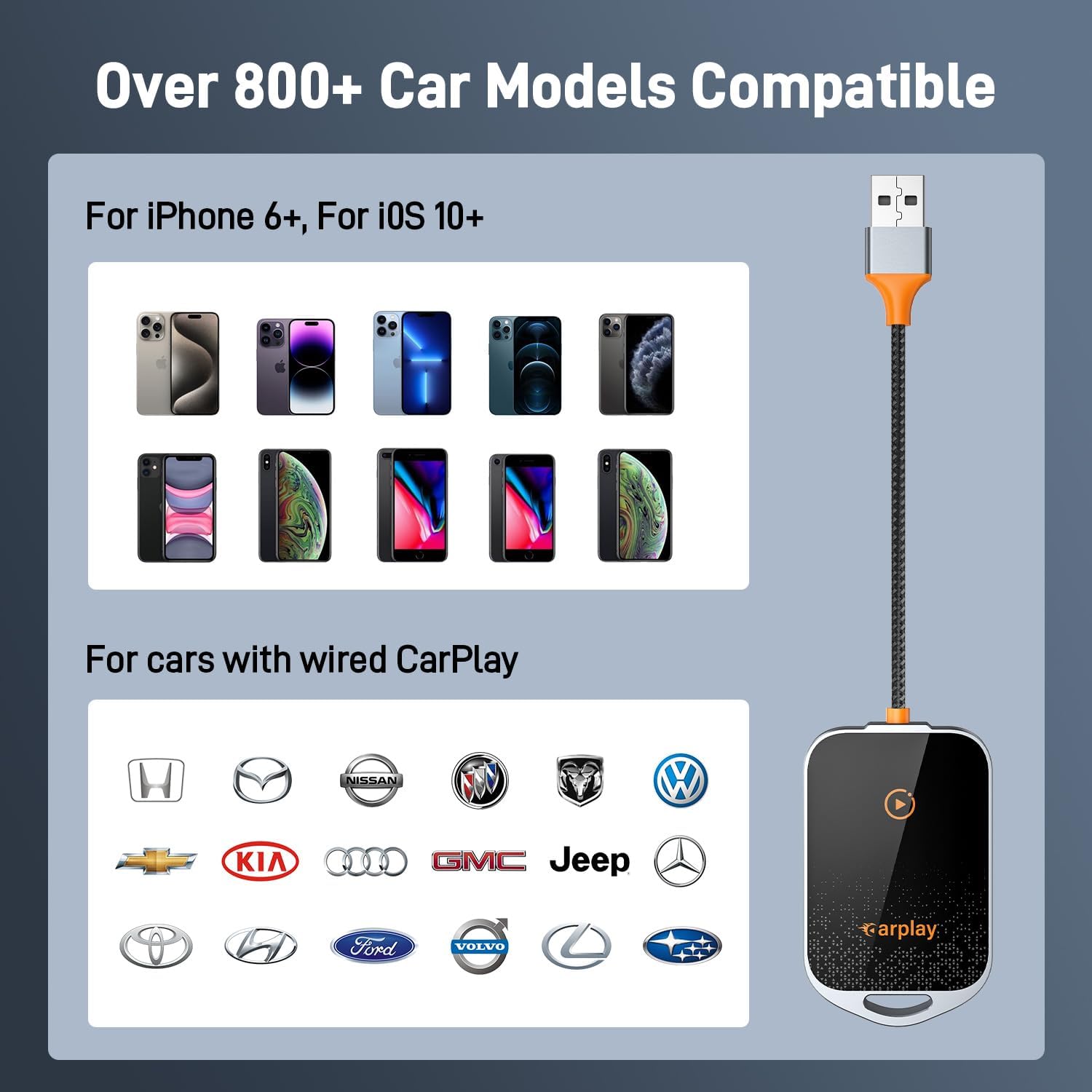 - 【Compatible with Over 800+ Car Models】Wireless Apple CarPlay adapter can work with almost all factory-installed CarPlay models. Supported iPhone: iPhone 6 and above & iOS 10 and above. (ONLY designed for cars equipped with wired Apple CarPlay, not with any other system). Comes with a USB A-C and a USB A extension cable, which allows it to access different ports.
