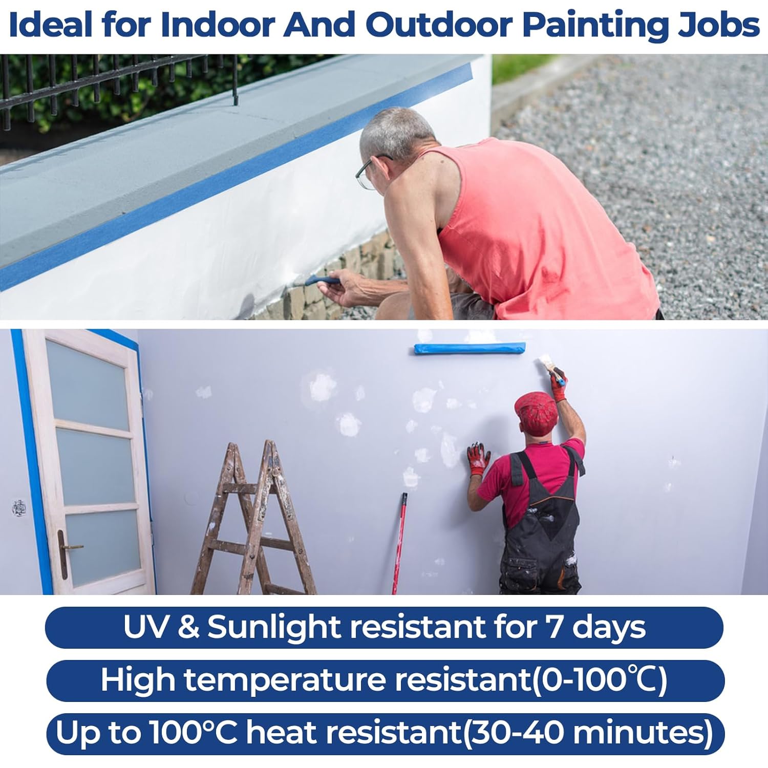 - ๐๐๐ฌ๐ข๐๐ฎ๐-๐ ๐ซ๐๐: Blue painter's tape is made with high-quality pressure-sensitive water-based adhesive and crepe paper, ensuring a residue-free, non-damaging surface to protect your wall. It resists sun and moisture and remains effective on both interior and exterior surfaces for up to 7 days without leaving marks