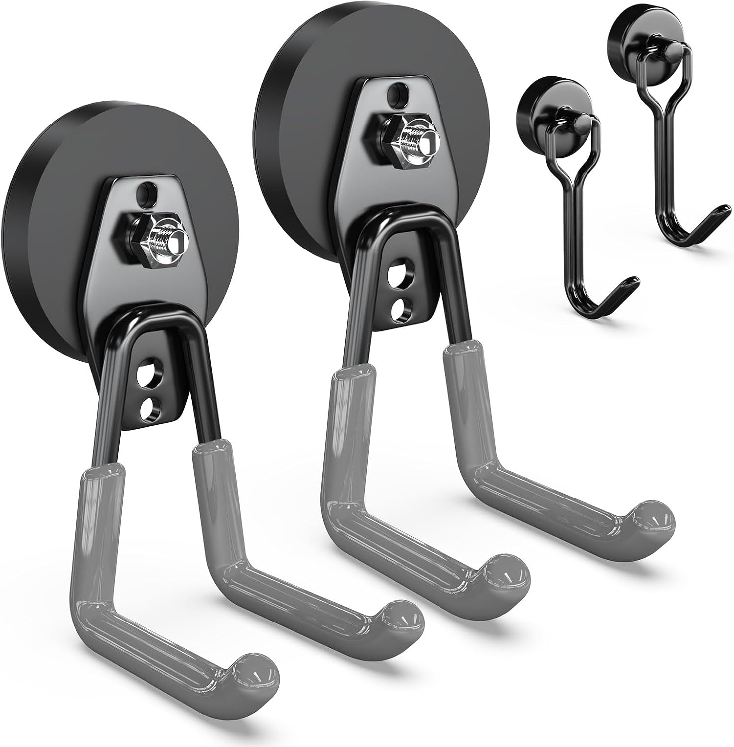 - Innovation Design Magnetic Hooks: Save yourself the hassle of drilling holes, simply attach extra strong magnetic hooks on metal surface, you can move them around as your needs change. The large magnetic hook has a dual-hook design for versatile use and can be separated into magnet and hook components. Our magnets with garage hooks heavy duty are coated with non-slip PVC and has protective sleeves to prevent scratches and rust