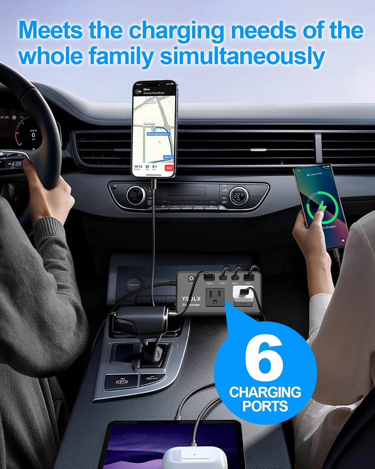 - Camping and Outdoor Activities: In wilderness environments without access to traditional power sources, the Car Inverter can be connected to a vehicle's cigarette lighter adapter, and with 6 output ports, it can power lights, fans, small kitchen appliances, and more, making your outdoor life more comfortable and convenient