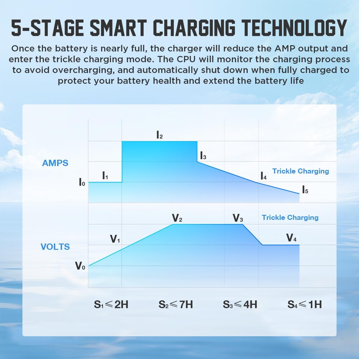 - 【36V 20A EZGO Fast Charger】Our 36V ezgo charger provides 20A fast charging speed, which can fully charge a 100AH battery in 6 hours, saving 15 hours than a 5A charger.It uses an advanced 5-stage intelligent charging technology.When the battery is nearly full, ezgo charger will reduce the AMP output and enter the trickle charging mode.The CPU will monitor charging process to avoid overcharging, and automatically shut down when fully charged to protect your battery health and extend battery life.