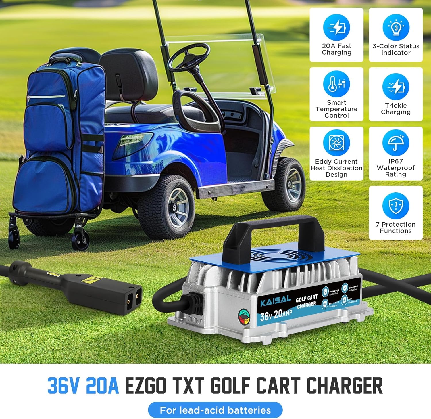 - 【16FT Long Cable & Lightweight】The 36v golf cart charger ezgo comes with a 16FT extra long cable (10ft input cable + 6ft output cable), providing great flexibility without the need for additional extension cords. Integrated cable plug minimizes problems with ezgo txt socket failure due to poor contact. The 36V ezgo golf cart charger weighs only 7 pounds and can be carried anywhere.