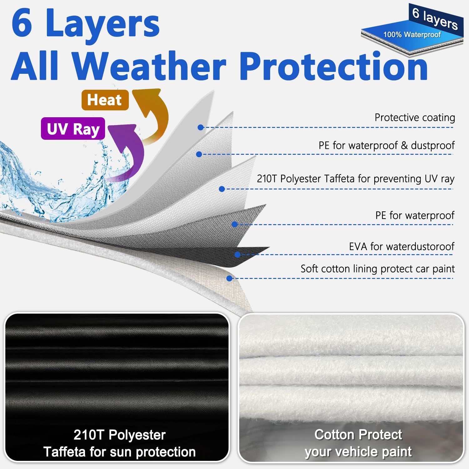 - All Weather Protection - car covers made of 210T silver high-density polyester taffeta are perfect for indoor and outdoor use, no matter the sun or the cold weather, protect your car from UV rays, snow, rain, frost, sand, dust, leaves, branches, and bird dropping. Highly reflective anti-UV coating can keep the car cool even on sunny days. The thicker cotton effectively prevents scratches and dust accumulation.