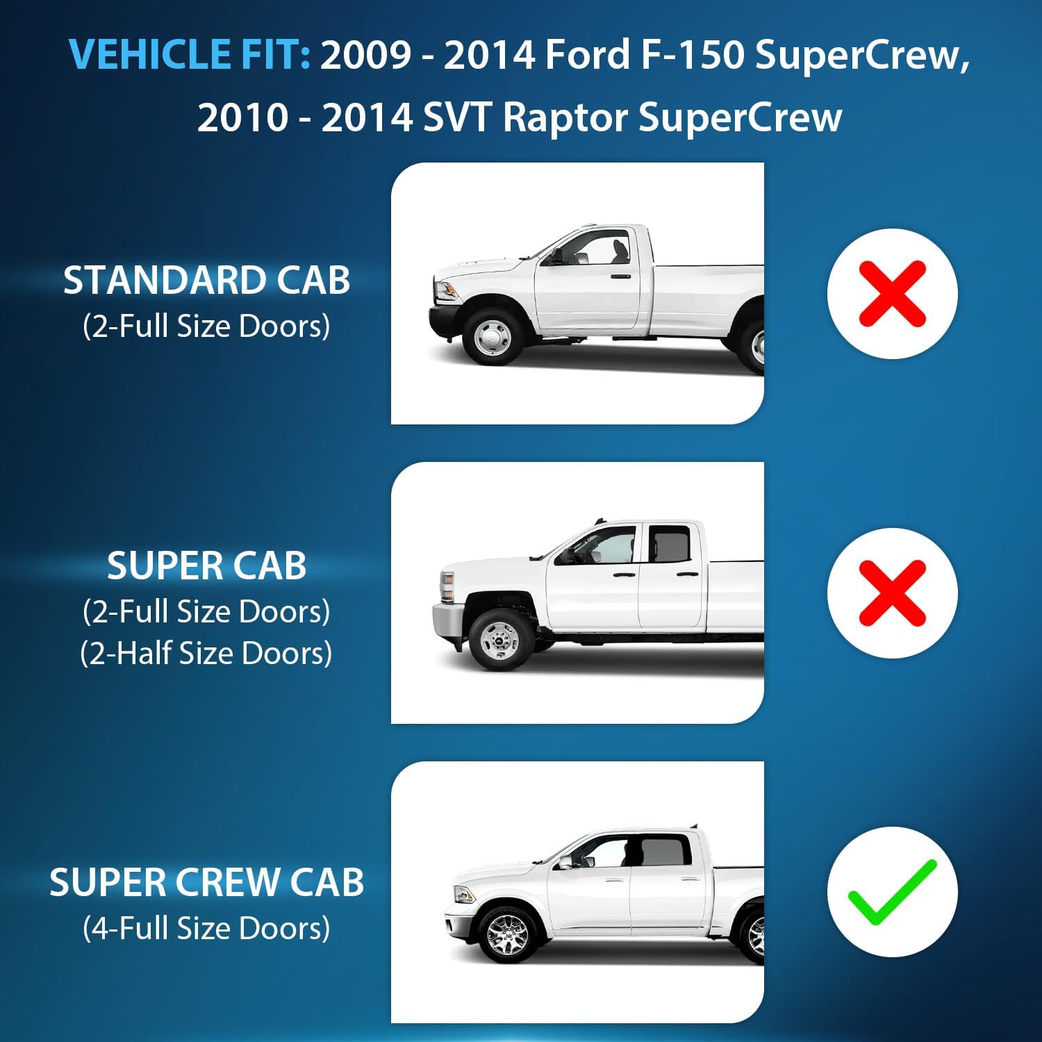 - FITMENT:2009 - 2014 Ford F150 Super Crew, 2010-2014 F150 SVT Raptor Super Crew