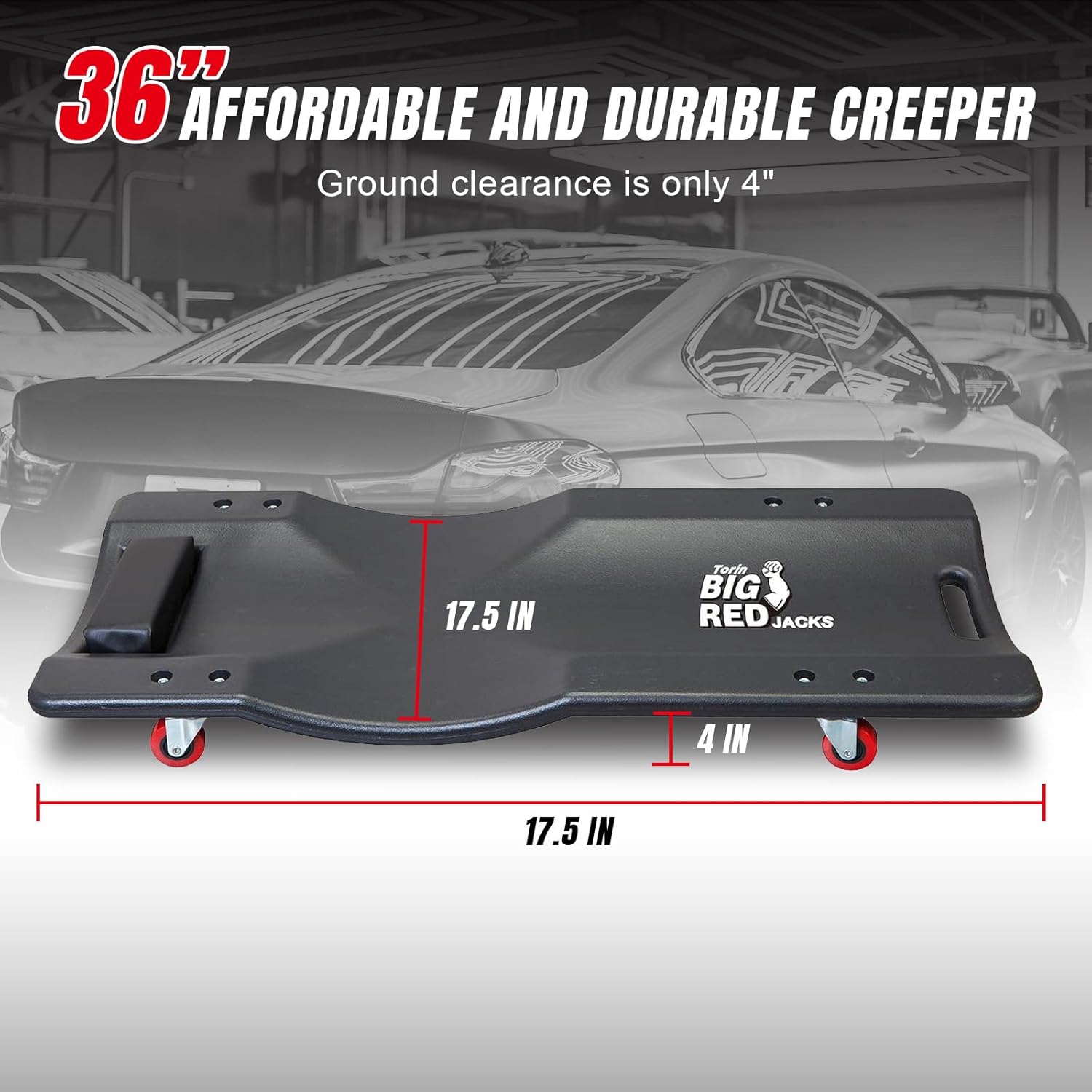 - One-piece, blow molded plastic mechanic cart measuring 36" length and has a low-profile, making it comfortable to work on your car, truck, SUV, van, and more