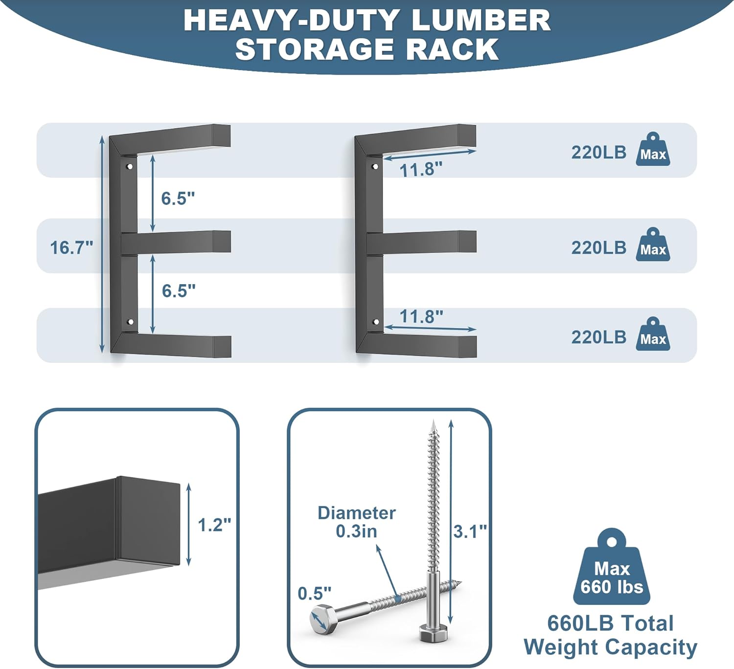 - Heavy Duty Lumber Storage Rack - The lumber storage rack is crafted from high-quality steel with a smooth powder-coated finish. Its exceptionally strong welds provide excellent load-bearing capabilities, total weight capacity of 660 lbs.