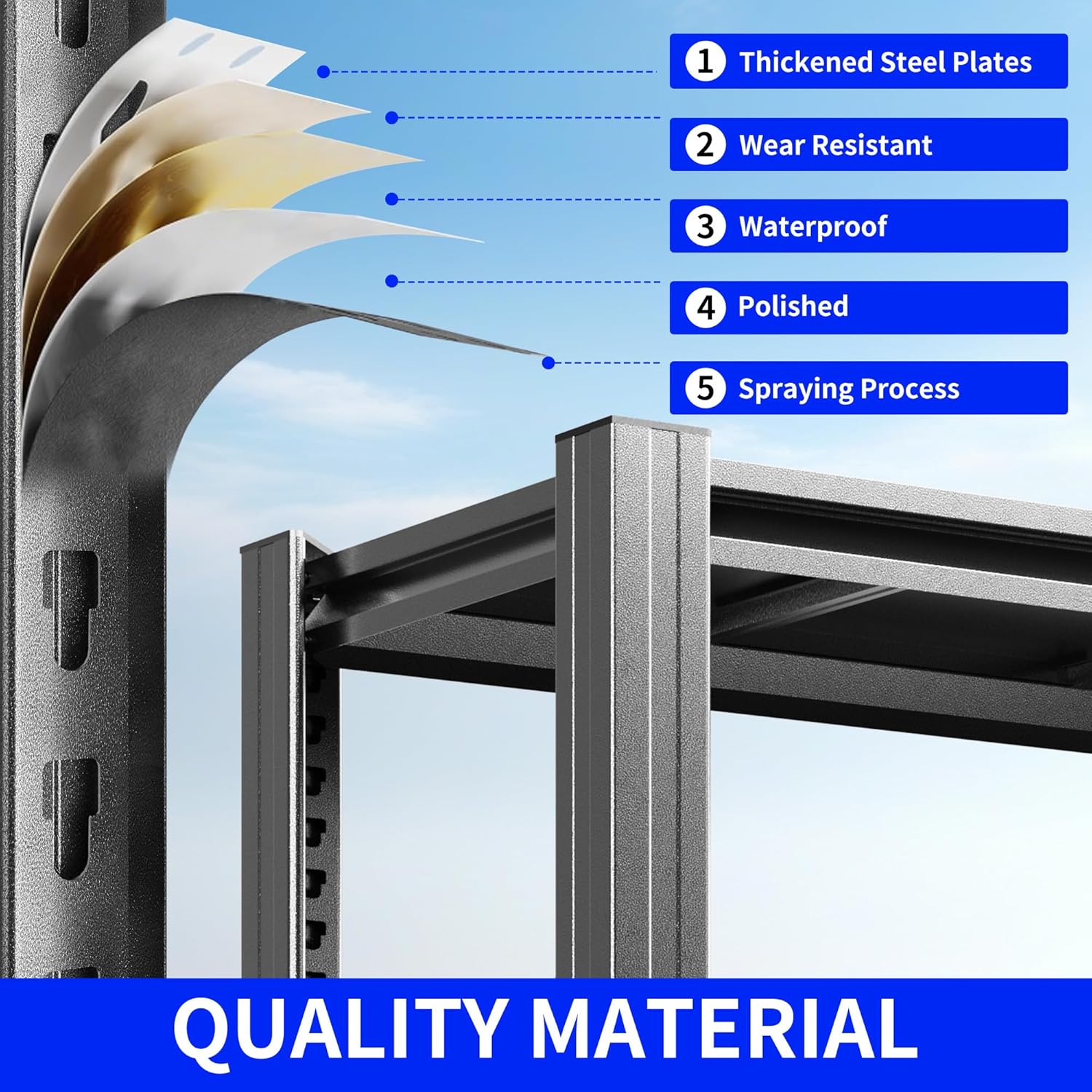 - Thickened and Widened with Strong Load-bearing:This metal storage shelves is made of thickened and thicker double-layer metal columns. Each partition is reinforced with a metal crossbar underneath, which is more stable and sturdy. So each layer of the storage shelving can load 600LBS, and the whole heavy duty rack can load 3000LBS.