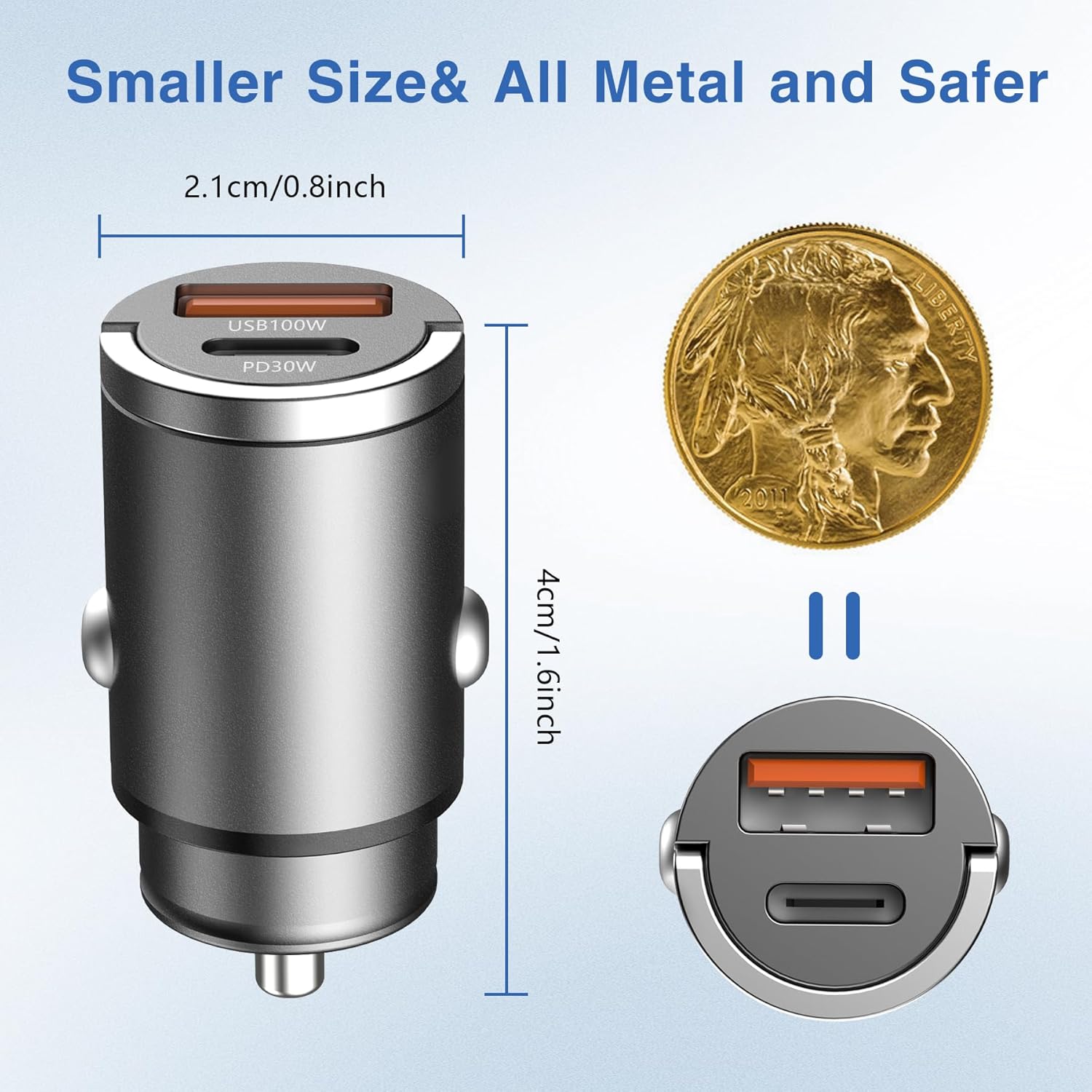 - 【All Metal, Smaller and Safer】The high-density aluminum alloy shell can help the car charger to dissipate heat in the charging process, effectively improving the charging efficiency by about 30%, and absolutely no melting and danger. The all-metal body also has a unique sense of design and luxurious texture.