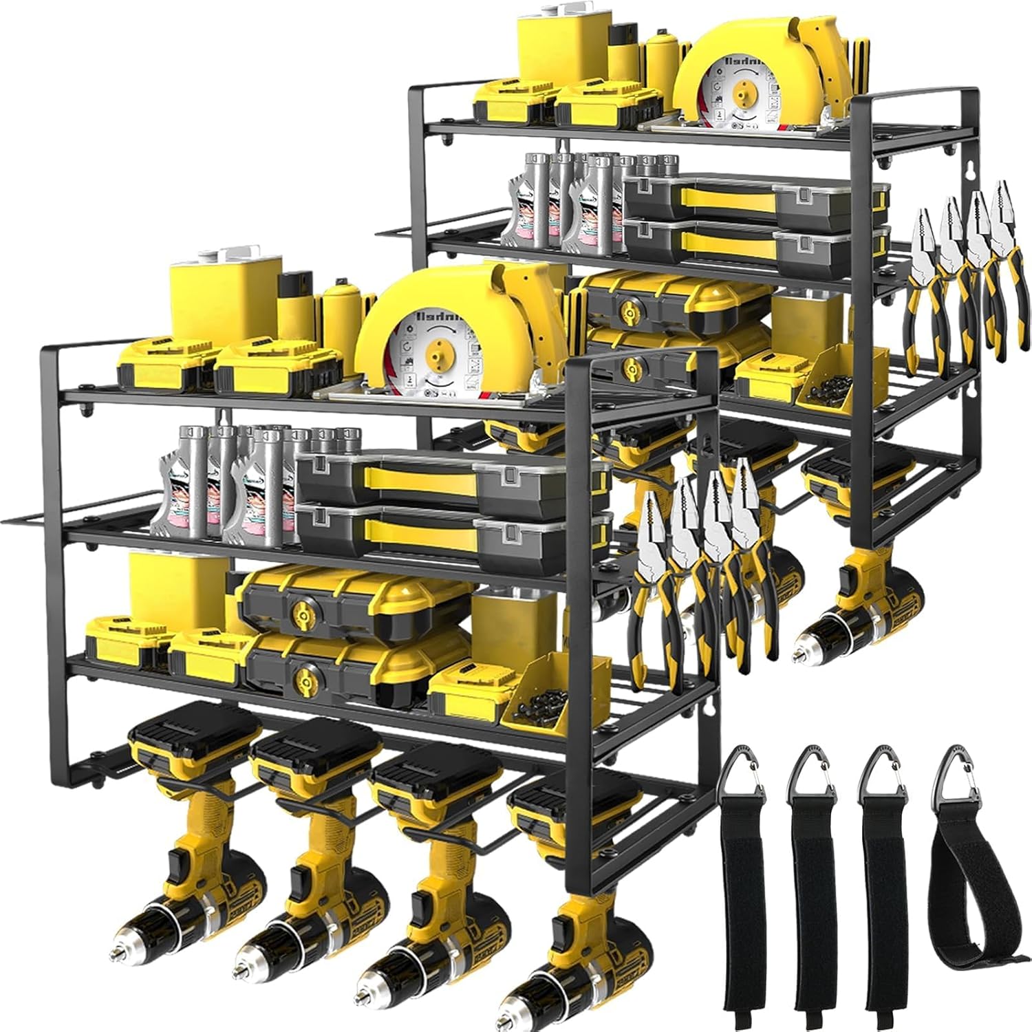 - Large Capacity 4-Tier Design: The garage tool organizer wall mount holds up to 8 cordless drills and other heavy and small tools. and a hammer holder, pliers holder and screwdriver holder are added to the side