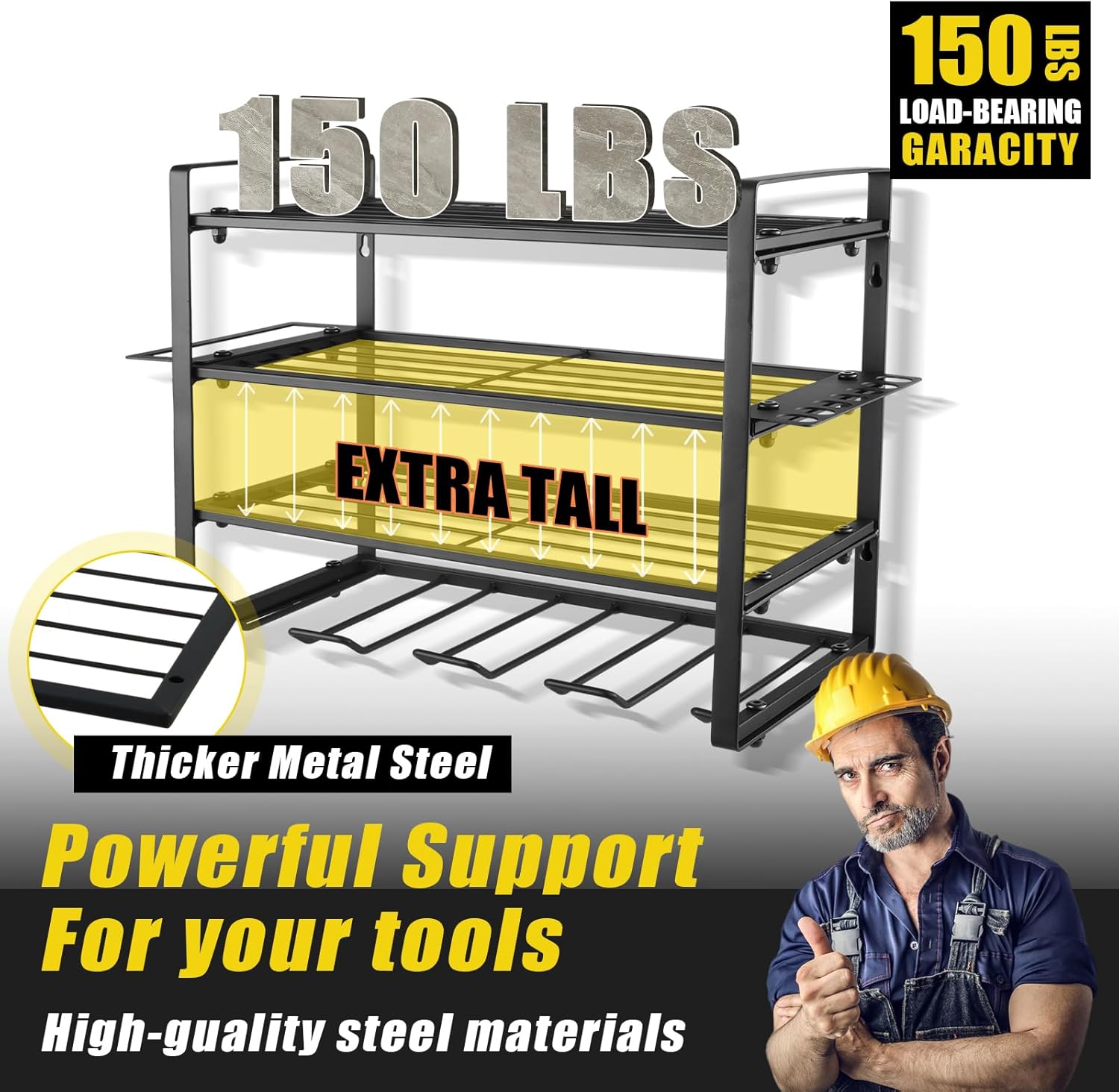 4 Layers Power Tool Organizer Wall Mount, Garage Wall Shelving, 4 Drill Holder Wall Mount, Cordless Tool Organizer, Garage Storage Rack with 4 Extension Cord Holder