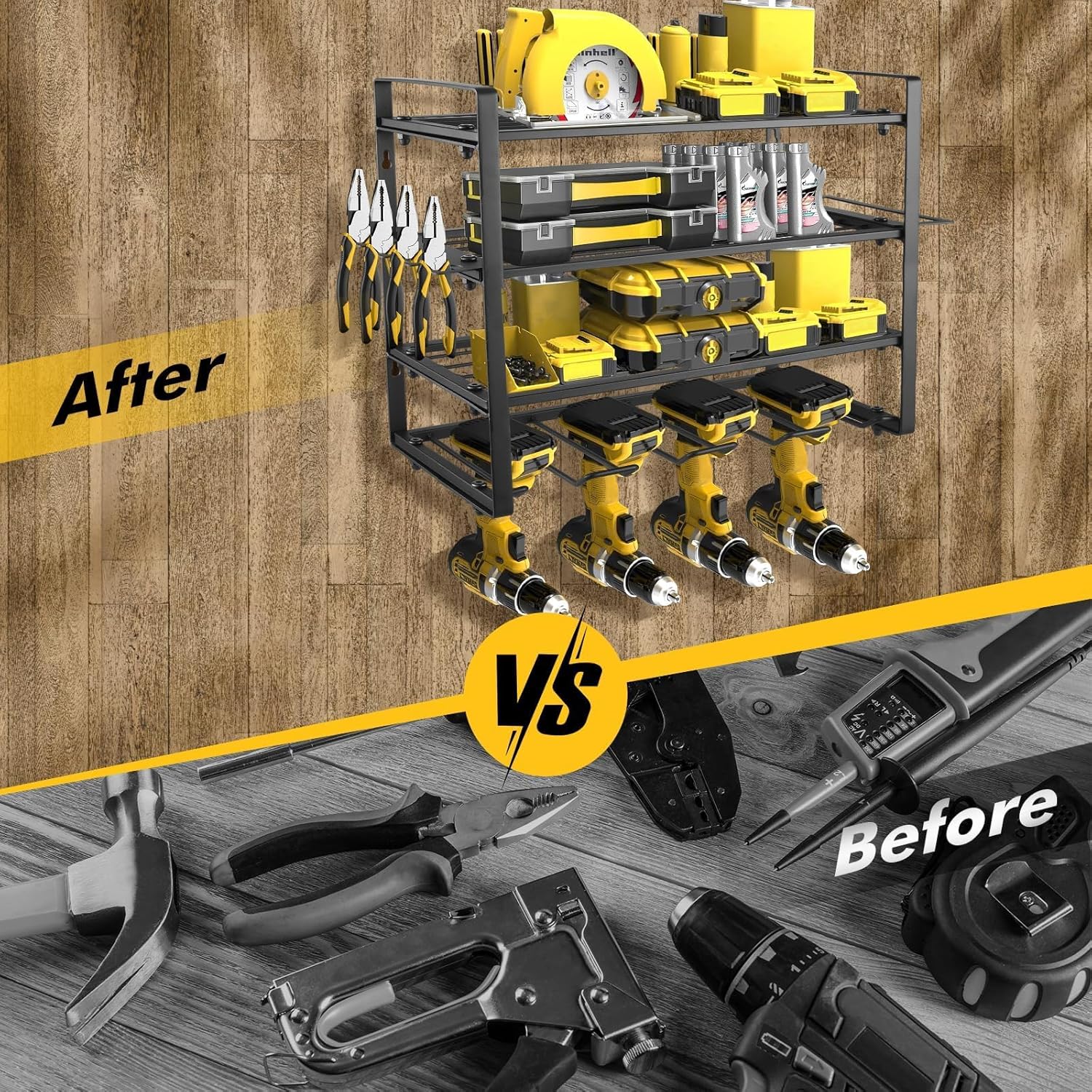 - Large Capacity 4-Tier Design: The garage tool organizer wall mount holds up to 8 cordless drills and other heavy and small tools. and a hammer holder, pliers holder and screwdriver holder are added to the side
