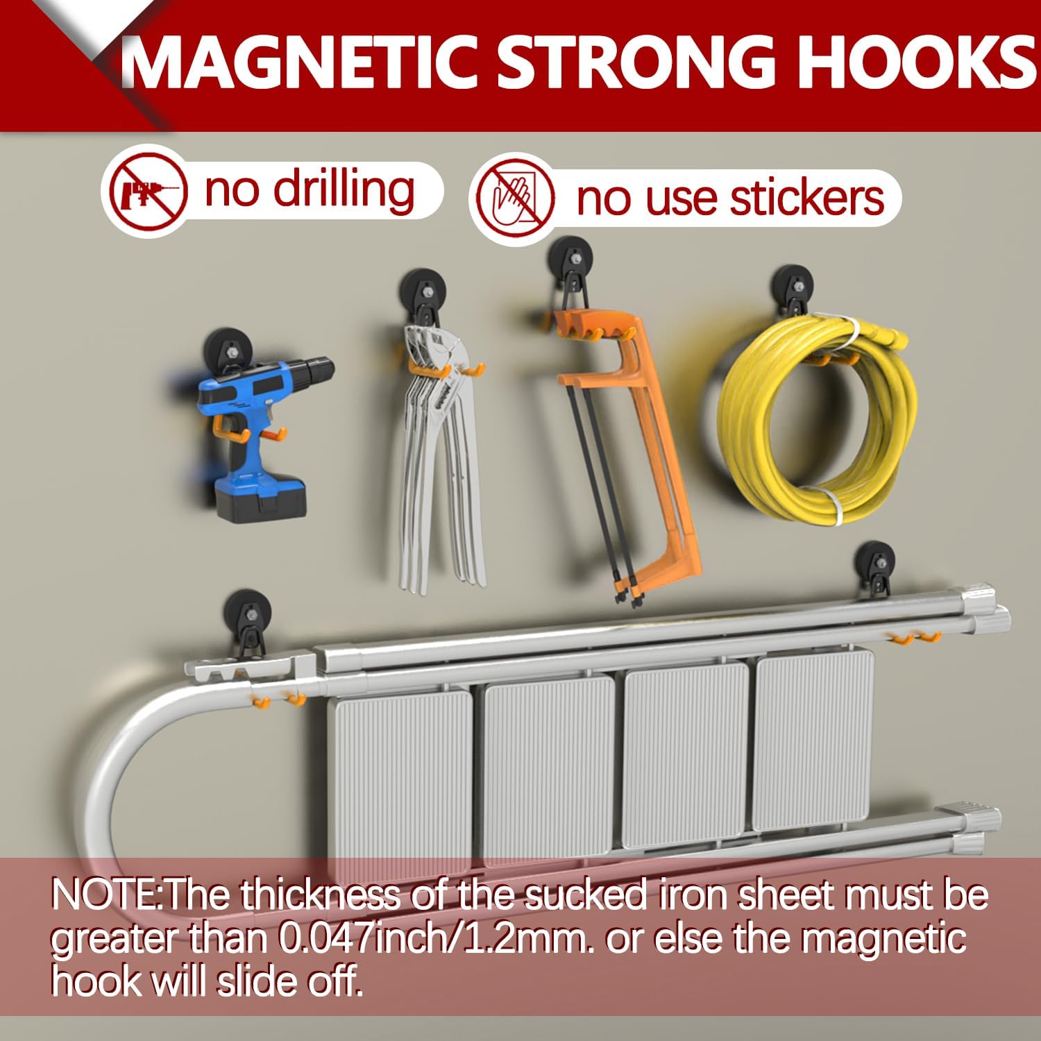 - Easy To Install Strong Heavy Duty Hooks: 2 usage options available: (1) heavy duty magnetic hooks for garage can be adsorbed on any metal surface. No tools, drilling, or screws are required for installation, ensuring no damage to the surface. (2) Alternatively, you can remove the magnet and use the garage storage hooks independently. For storing heavier tools, we provide sturdy screws that can be used to securely install the heavy duty hooks for garage on any wall surface