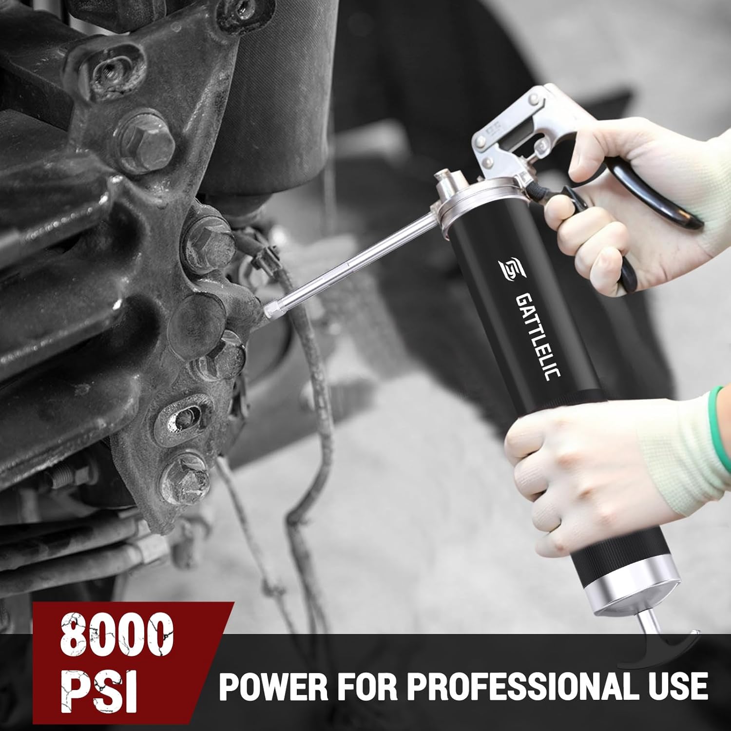 - Premium Quality & Durability: The GATTLELIC grease gun features a high-quality die-cast aluminum construction, providing a maximum working pressure of 8000 PSI. Designed for heavy-duty use, this grease gun ensures long-lasting performance in machinery, vehicles, and more