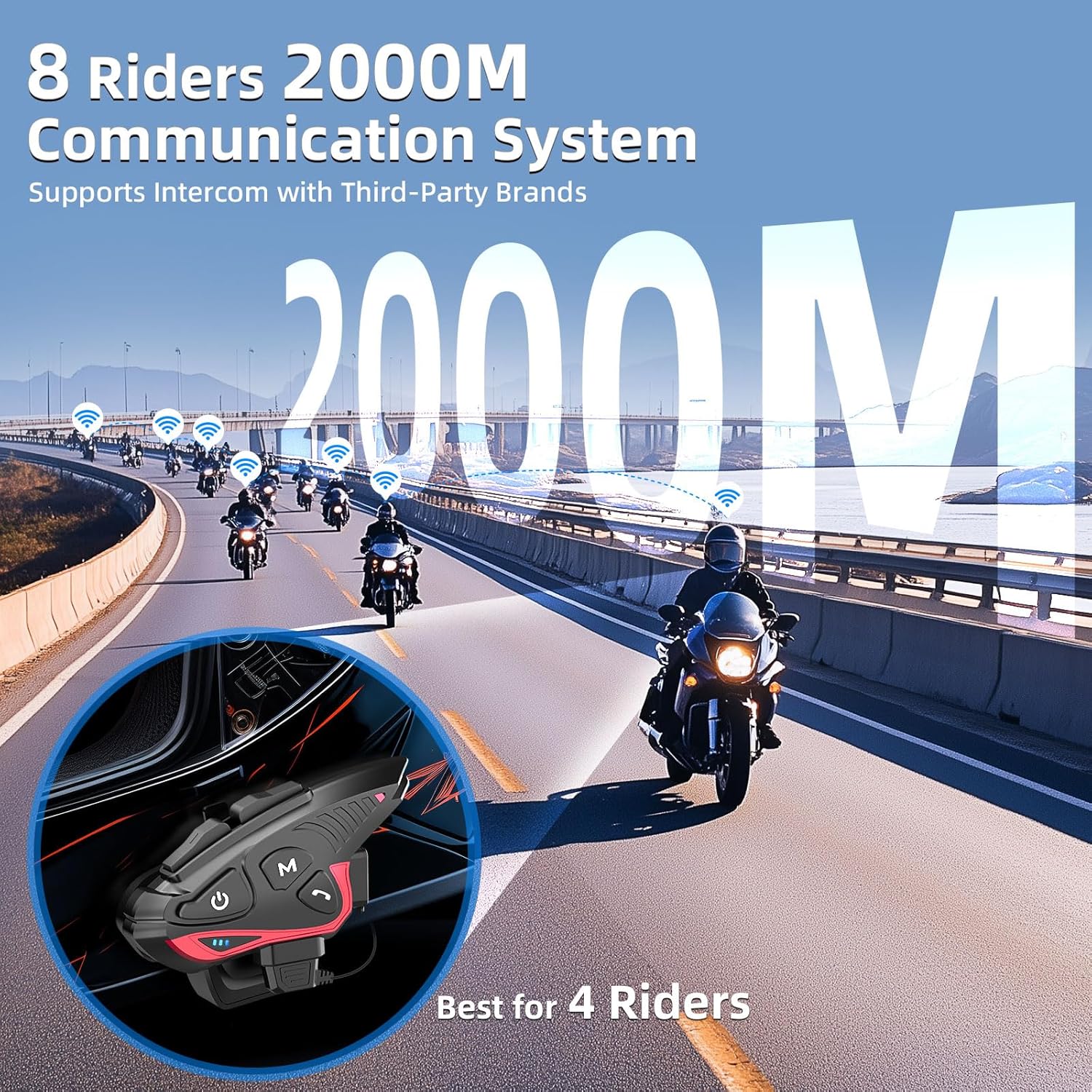 Moman Motorcycle Intercom Headset, CP-S 8 Riders 2000M Group Helmet Communication System, Universal Pairing with HiFi Noise Cancellation Music Share FM Radio Helmet Group Communicator for Motorbike