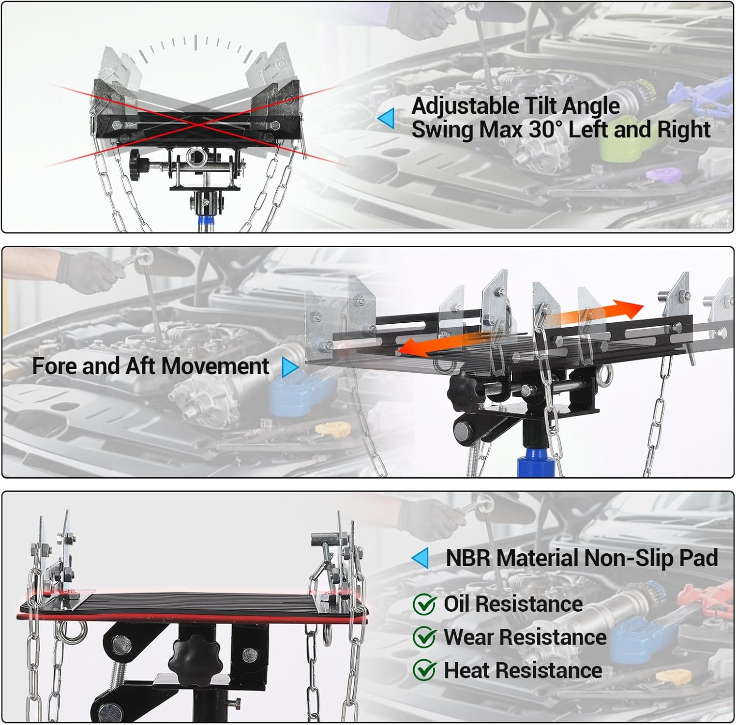 - ăVersatile Applicationsă- This heavy-duty hydraulic transmission jack is ideal for America's automotive professionals and enthusiasts alike, perfect for the installation and removal of various automotive and light truck transmissions, making it a must-have tool for any workshop or garage.