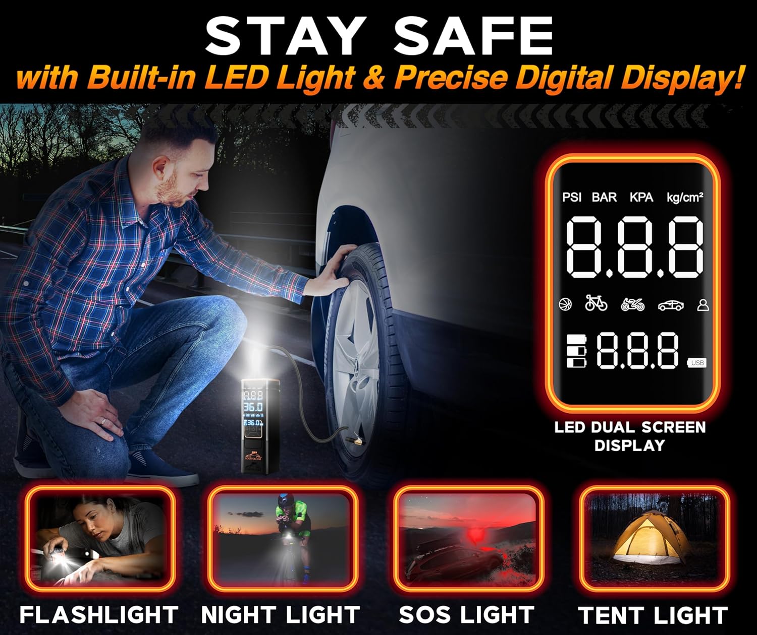 - Built-in Light & Digital Display: Our portable air compressor for car tires includes a built-in light and digital display for easy, precise use even in the dark. The extra tire pressure gauge ensures you maintain optimal tire health.