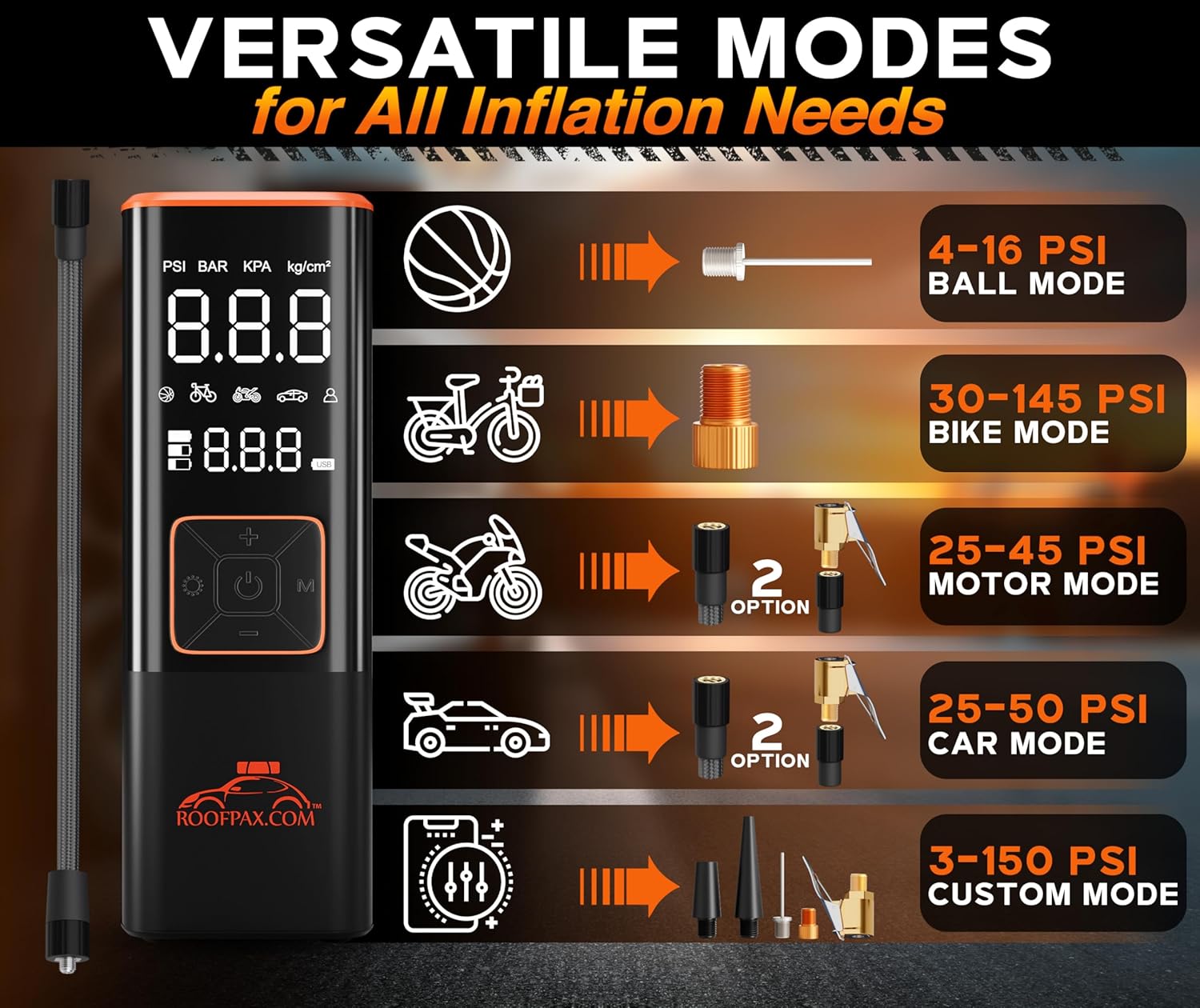 - Five Versatile Modes: This portable tire inflator for cars features five modes—Car, Bike, Motorcycle, Ball, and Manual. It’s the ultimate air tire pump for car portable versatility, covering all your inflation needs.