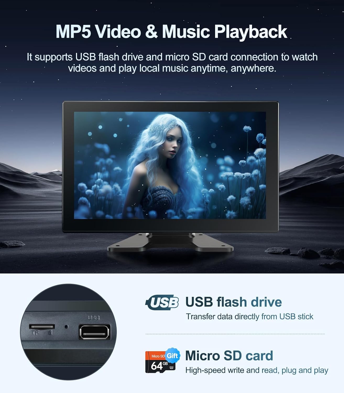 - ăBluetooth & Entertainmentă: The dash cam monitor is equipped with Bluetooth 5.0 and USB 2.0 ports, supports Bluetooth connection, USB flash drive devices to play videos and music, and comes with an extra 64GB SD Card to meet your storage needs, making your journey more relaxing and fun.