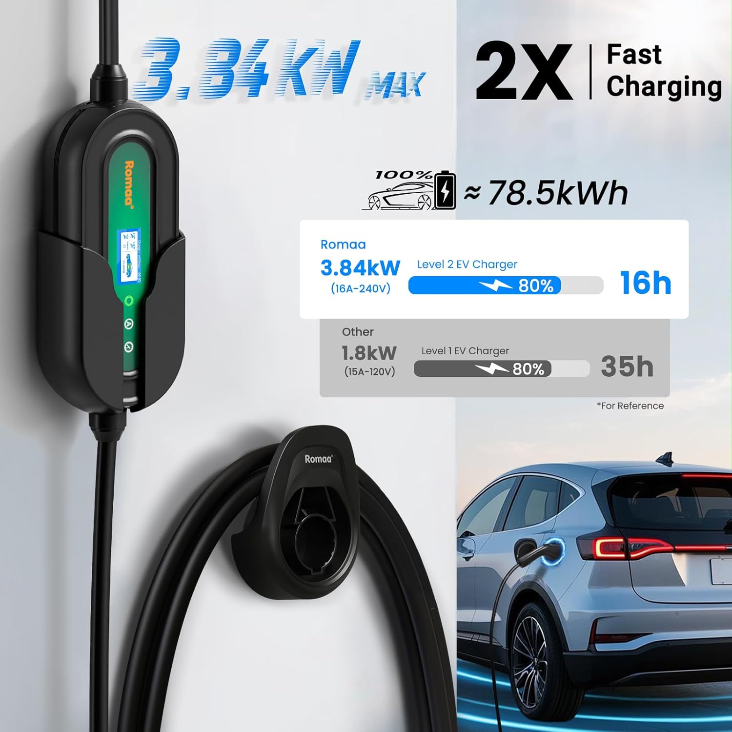 - Charge Anywhere β Level 1/2 Flexibility: The Romaa portable EV charger supports both Level 2 EV charging with nema 6-20 ev charger plug (max 3.84 kW, 240V, 16A), adding approximately 15-20 miles of range per hour, and Level 1 EV charging (max 1.76 kW, 110V, NEMA 5-15 Adapter), adding approximately 4-5 miles of range per hour; Not a fast charger β best for daily use, travel, and backup charging