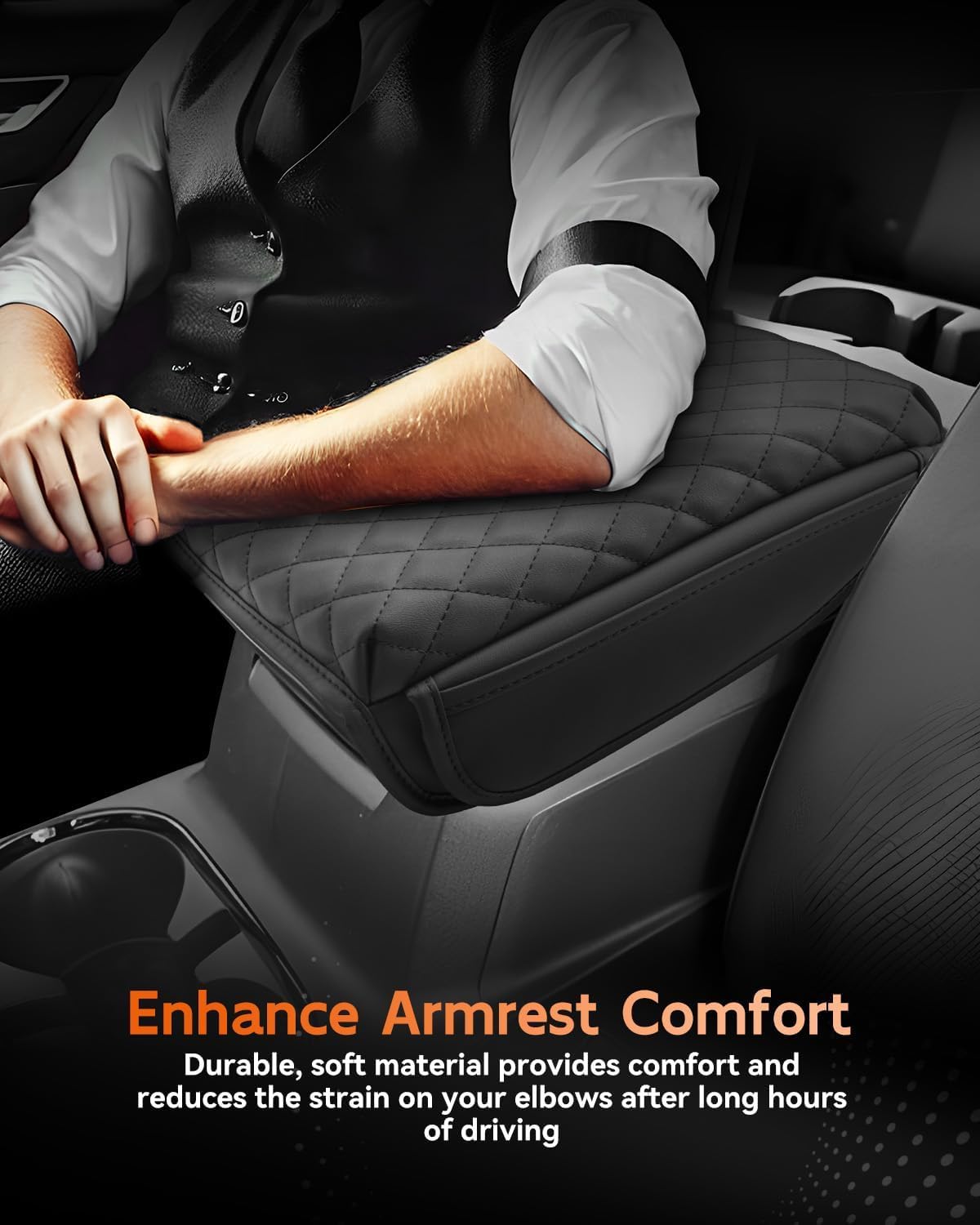 - [Easy To Install] Designed with a Velcro strap to secure it to the center console (no tools required). With super stretch and pull resistance, it will not change the open/close function of the armrest box.