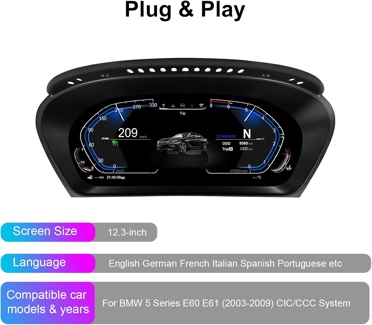 - π[Applicable Models] The LCD digital instrument cluster is precisely customized for BMW E60 E61 E63 E64(2003-2009) CCC CIC system. It is equipped with a 12.3 inch high definition screen boasting a resolution of 1920*720. Supports all original features.
