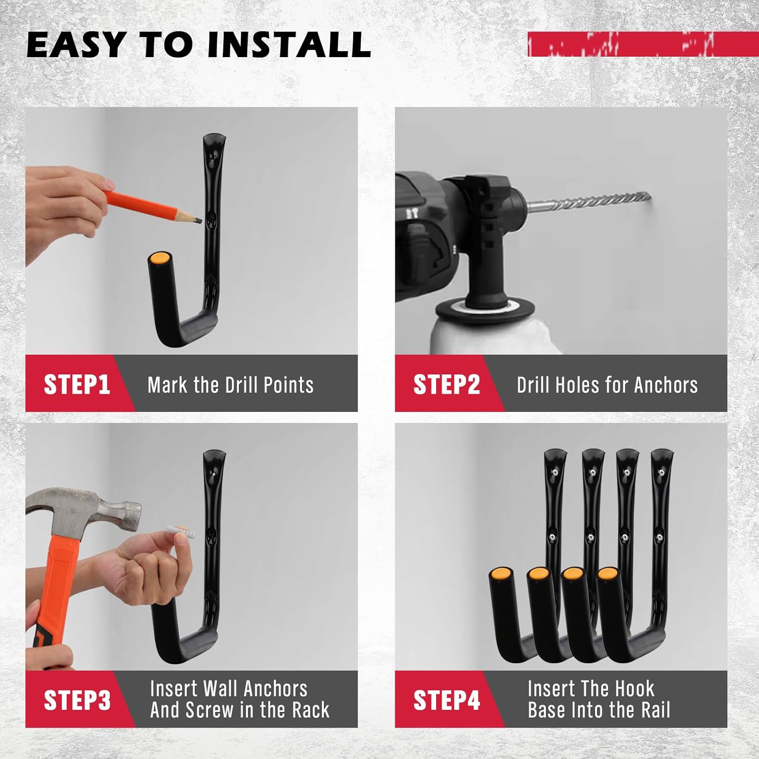 - STURDY CONSTRUCTION β Built from high-quality low-carbon steel, these heavy-duty garage wall hooks feature a rust-resistant powder-coated finish. They support up to 100lbs and include EVA arm protectors to prevent damage to your gear