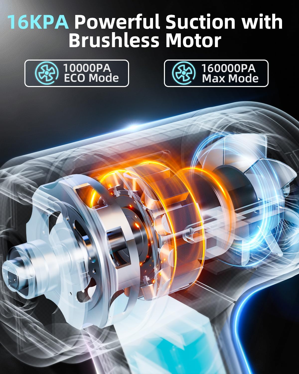 - MAX 16Kpa/120000RPM& 2 MODES: The car vacuum cleaner high power uses a 80W brushless motor that can provide a strong suction force of 16Kpa and 120000RPM high-speed wind force. It provides two cleaning modes: min-10Kpa and max-16Kpa. Switch the suction mode by pressing the switch button, and press the power button for 3 seconds to turn it off.