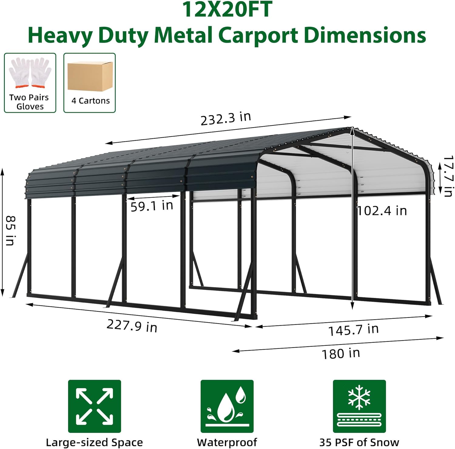 - DIMENSIONS - The outer dimensions of the heavy duty outdoor metal carport canopy are: 12 feet wide, 20 feet deep, and 8.5 feet high. The inner measurements of the outdoor large metal carport canopy are: 145.7'' wide, 232'' deep, and 102.4'' high. The eave height is 85 inches, and the maximum entrance height is 102.4 inches. Please note that the product will be divided into 4 packages, which may not arrive at the same time. Following the instructions makes the garage assembly easier