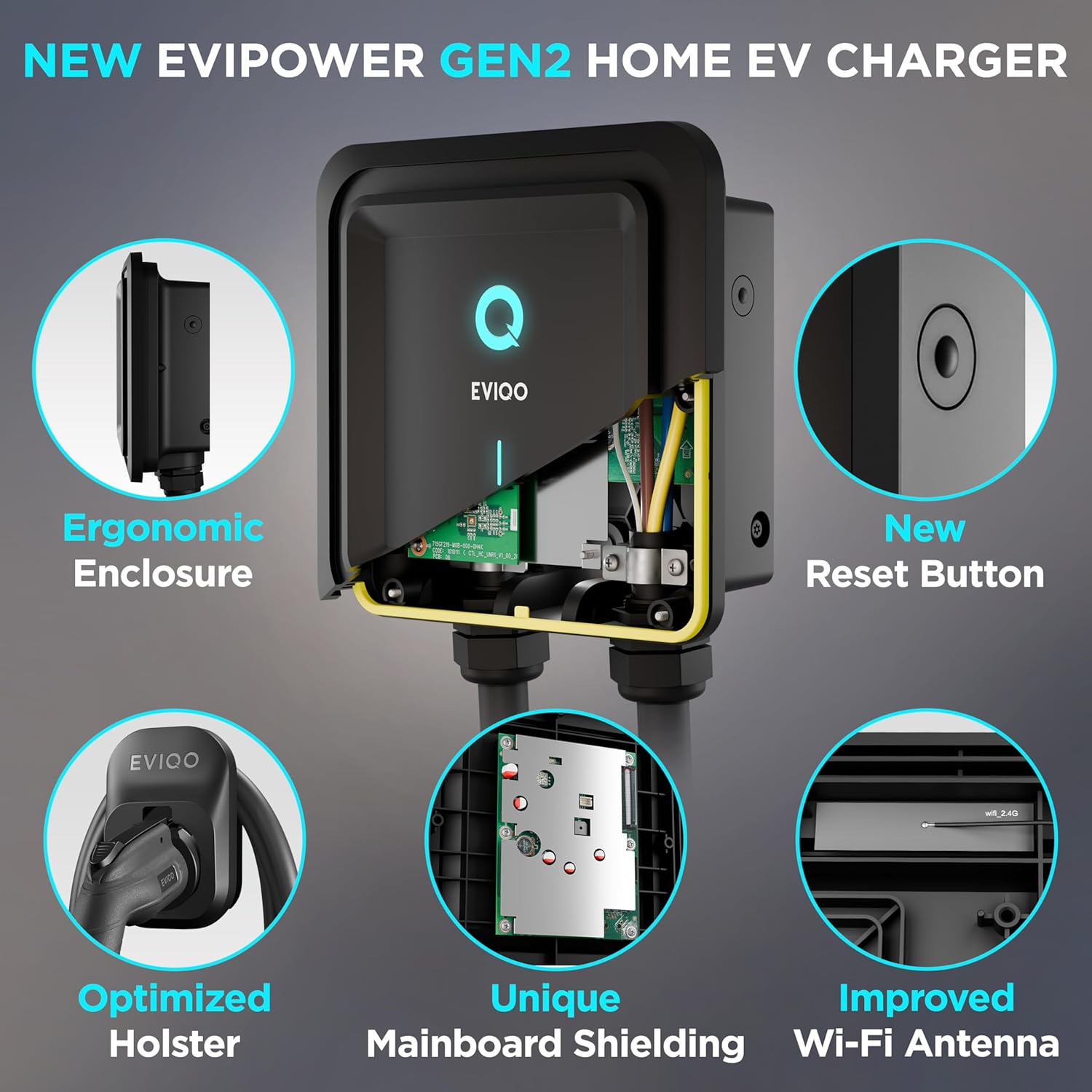 - ENHANCED WI-FI ANTENNA + SMART APP – Advanced Wi-Fi keeps EVIQO electric vehicle charging stations online in garage & basement. Control start/stop, set 6-48A current with 1A step, set schedules for your EV level 2 charger & charge off-peak, get reminders & track consumption/cost right in the app. Remote OTA firmware updates (2.4 GHz).