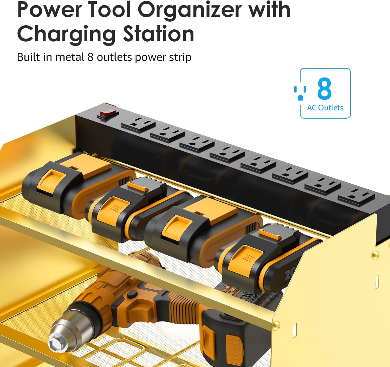 CCCEI Modular Power Tool Organizer Wall Mount with Charging Station. Garage 4 Drill Storage Shelf with Hooks, Drill Bit Heavy Duty Rack, Gold Tool Battery Holder Built in 8 Outlet Power Strip.