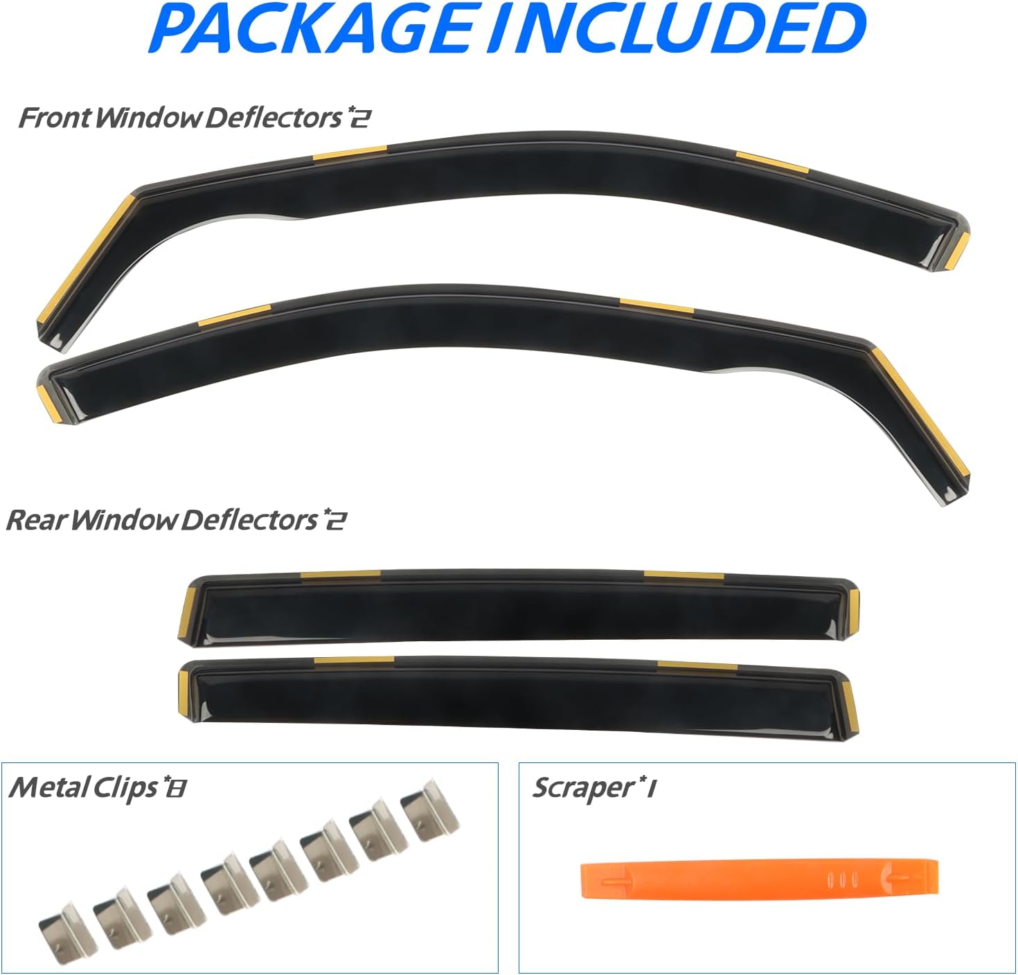 - DURABLE MATERIAL: Vent window deflectors made from high-quality and durable anti-shatter material that’s scratch resistant, will not be easy to crack, break, or chip. Created specifically for your vehicle's make and model to ensure sleek and streamlined appearance
