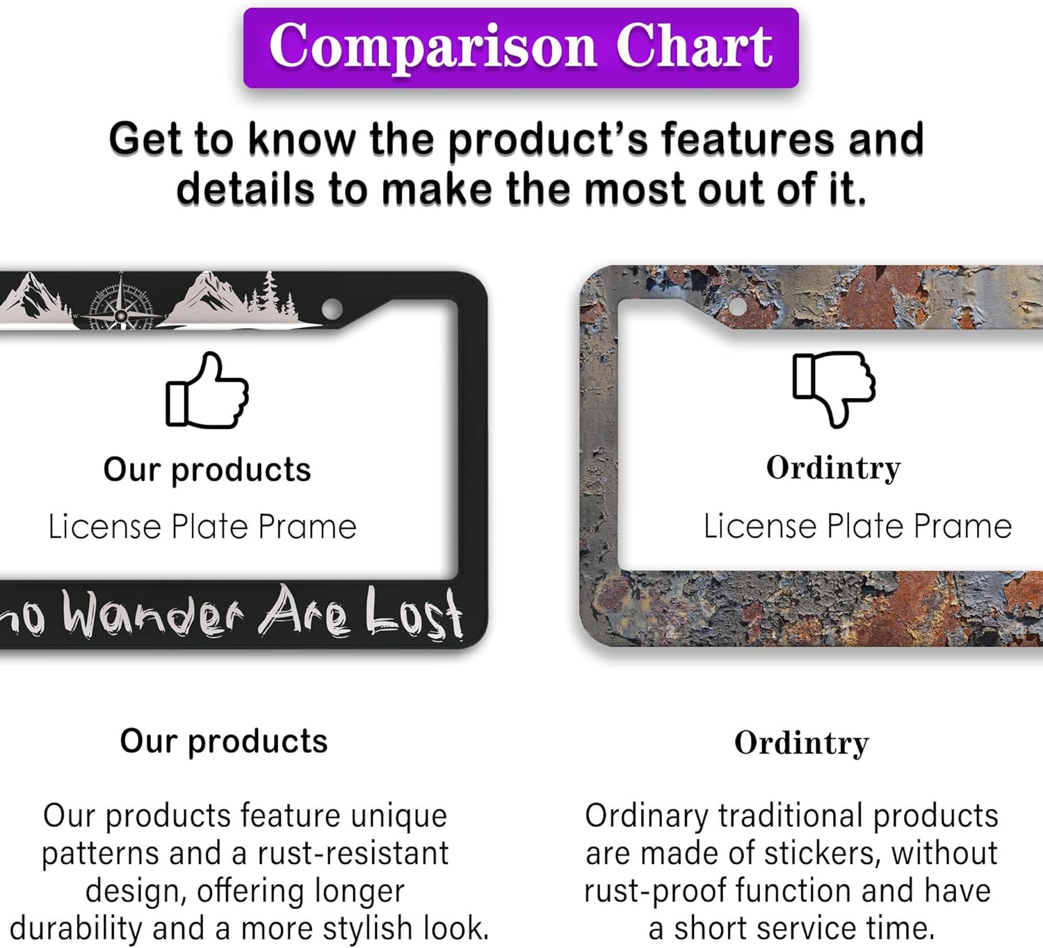 - ALUMINUM FRAME: This License Plate Frame is crafted from high-quality aluminum that is resistant to corrosion, rust, and harsh weather conditions. Its rugged reliability design ensures a long lifespan, making it capable of withstanding car washes and extreme weather, providing you with a reliable and stylish solution for your vehicle.